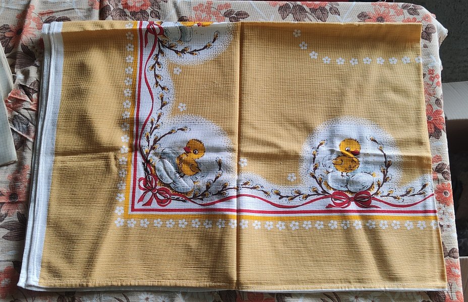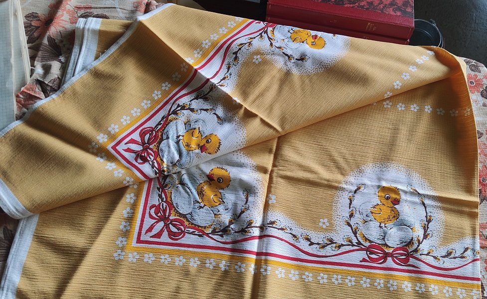 krásny nový retro veľkonočný obrus s kuriatkami uloženka rozmer 135x95cm, treba oprať stál dlho v skrini