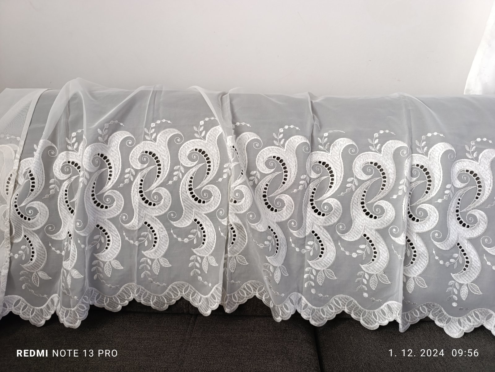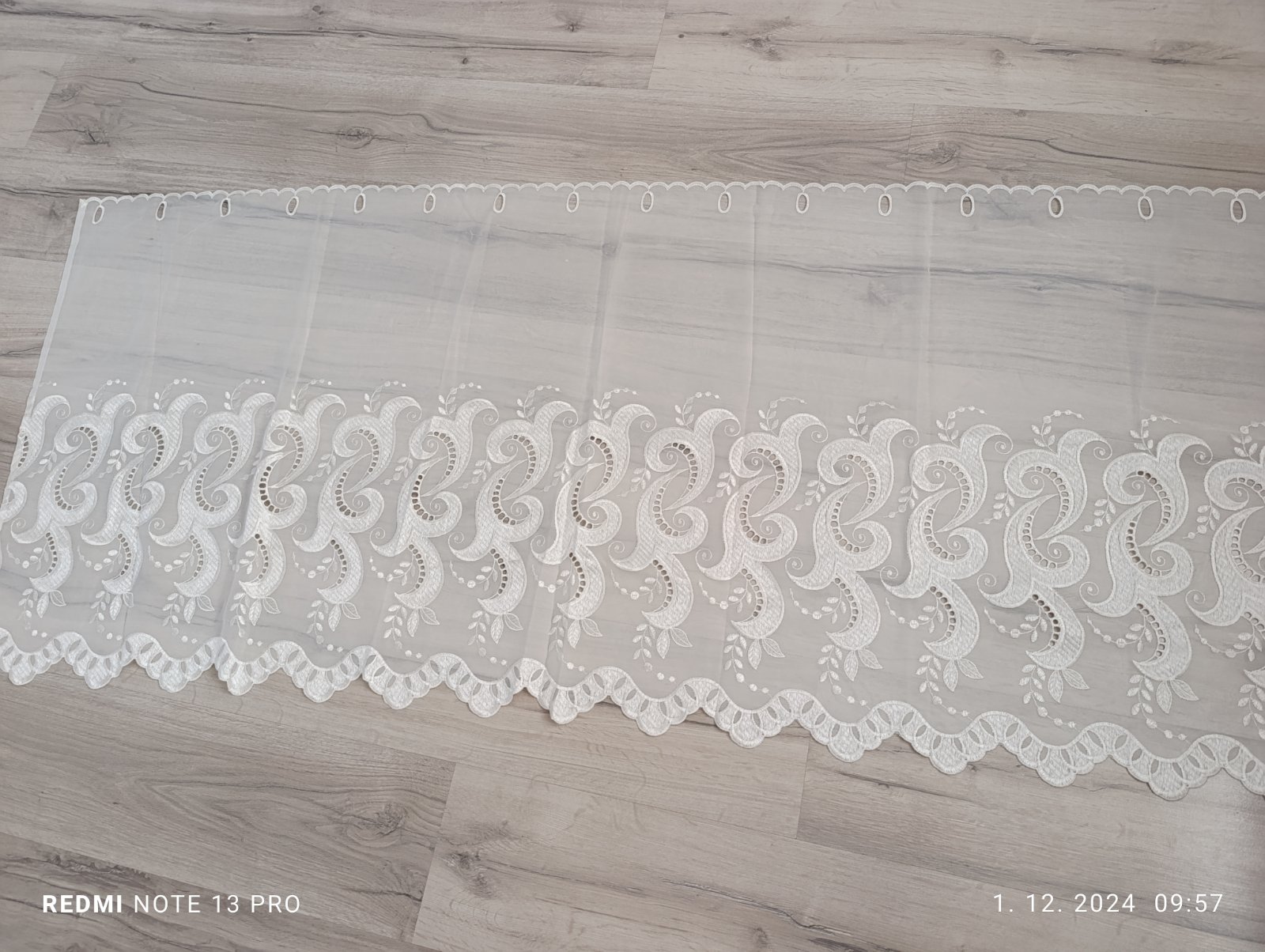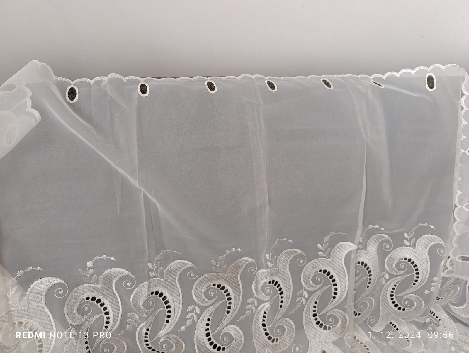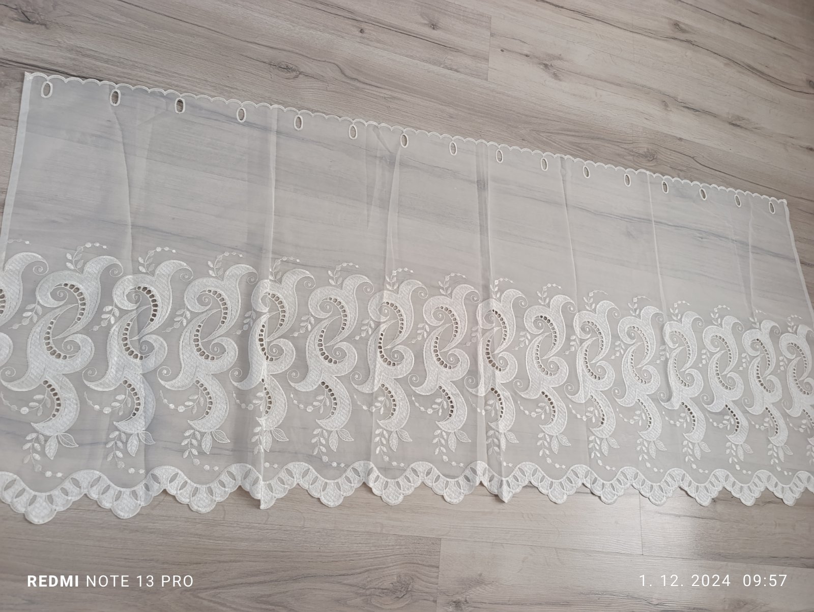 Vyšívaná voálová záclona. Je kvalitná, v top stave ako nová. Má otvory na garnížu... Pri výmene 10€