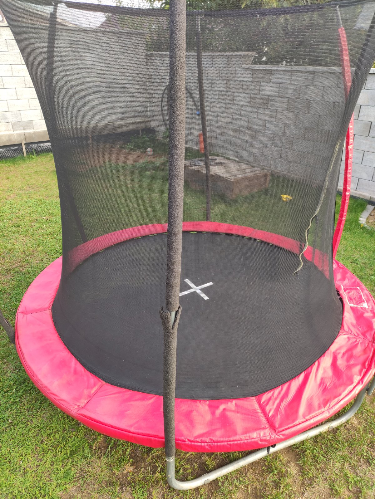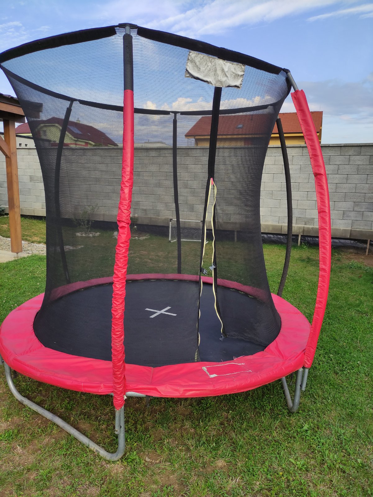 Trampolína je používaná cca tri roky, má známky opotrebovania, ale stále je funkčná. Na foto je vidieť, ktoré časti sú mierne poškodené, ale je to vada len vizuálna.