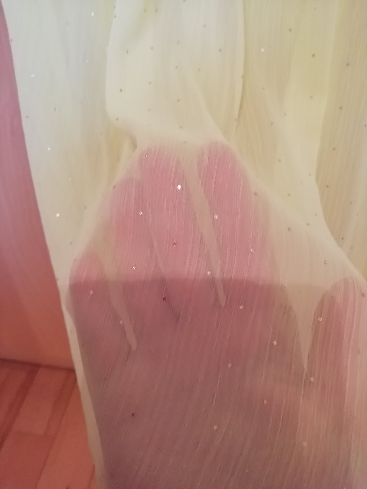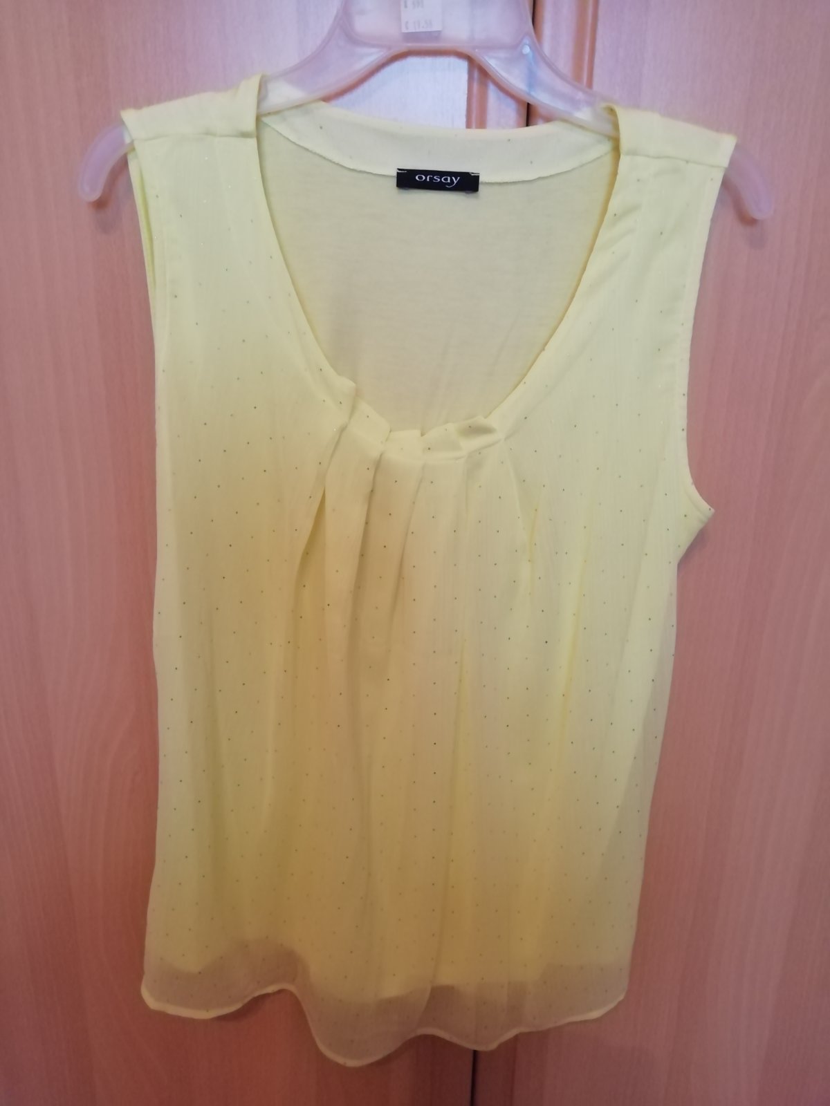 Tričko má jemnú citrónovo žltú farbu, je bavlnené len vpredu ma jemnú tylovu látku ktorá má lesklé bodky