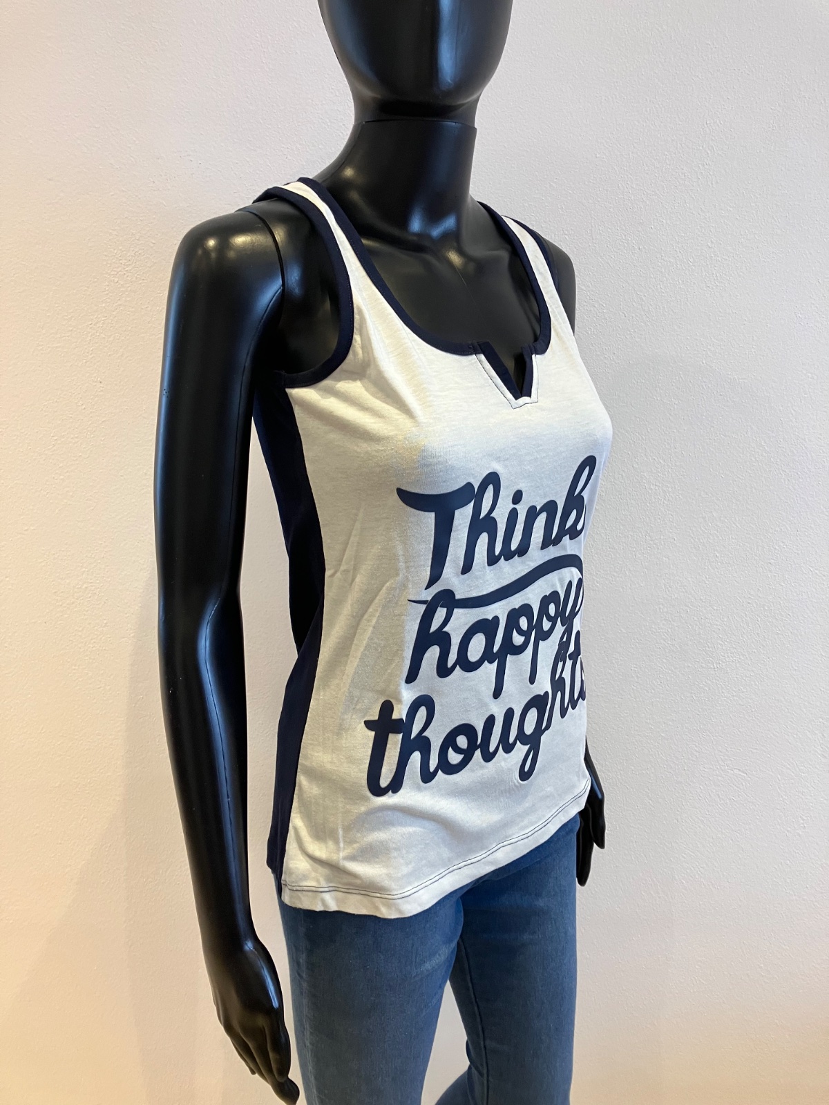 Tričko bez rukávov s tmavomodrým nápisom, vpredu biele, vzadu tmavomodré, s potlačou, elastické, materiál 90%bavlna,10%viskóza.