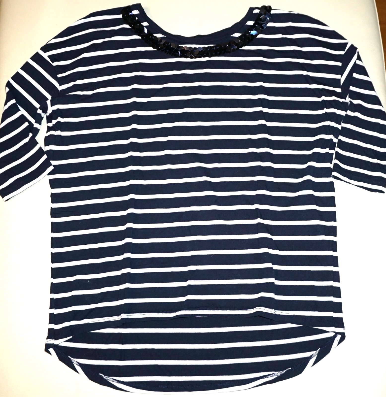 Elastický lesklý materiál, spodok na gumičku, voľný padavý strih, 3/4-tove rukavy. Farba ešte trochu tmavšia ako na fotke Rozmery : Šírka pod pazuchami 65 cm Dĺžka 58 cm