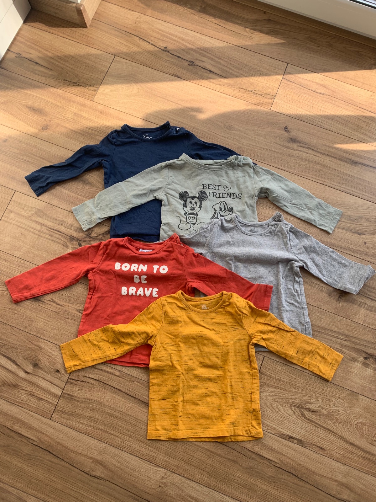 5ks triciek v top stave, kazde len parkrat oblecene kedze sme nosili skor bodynka ako tricka. znacky - cervene (fagottino), horcicove, modre a sive (f&f) a disney (sinsay).