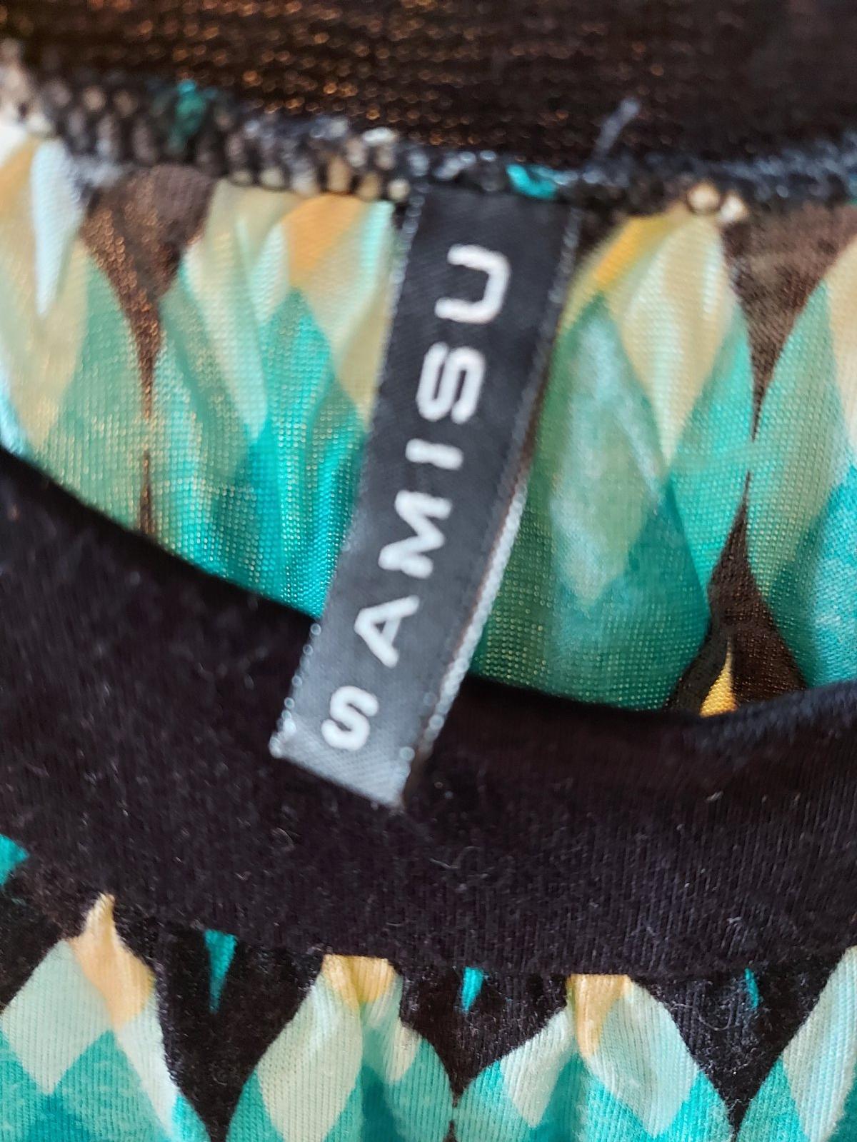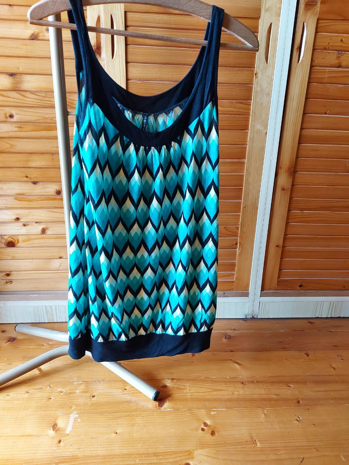 top AMISU na hrubšie ramienka, S/M, voľný strih, elastické, zeleno-čierno-žlté, š. pod pazuchami v kľude - 42, dĺžka - 72 aj s ramienkami, top dole ukončený patentom