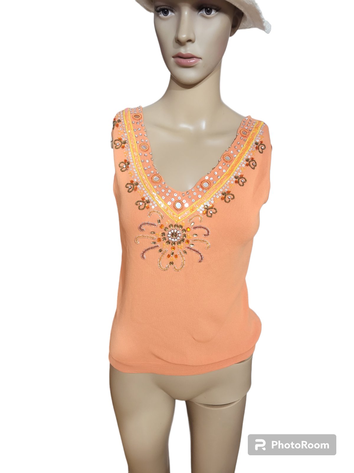 Oranžovo lososové dámske tričko so štruktúrou značky Ima Gini. Je elastické. Dĺžka je 50cm,obvod hrudníka je 80cm a obvod pása je 74cm. kód 1897
