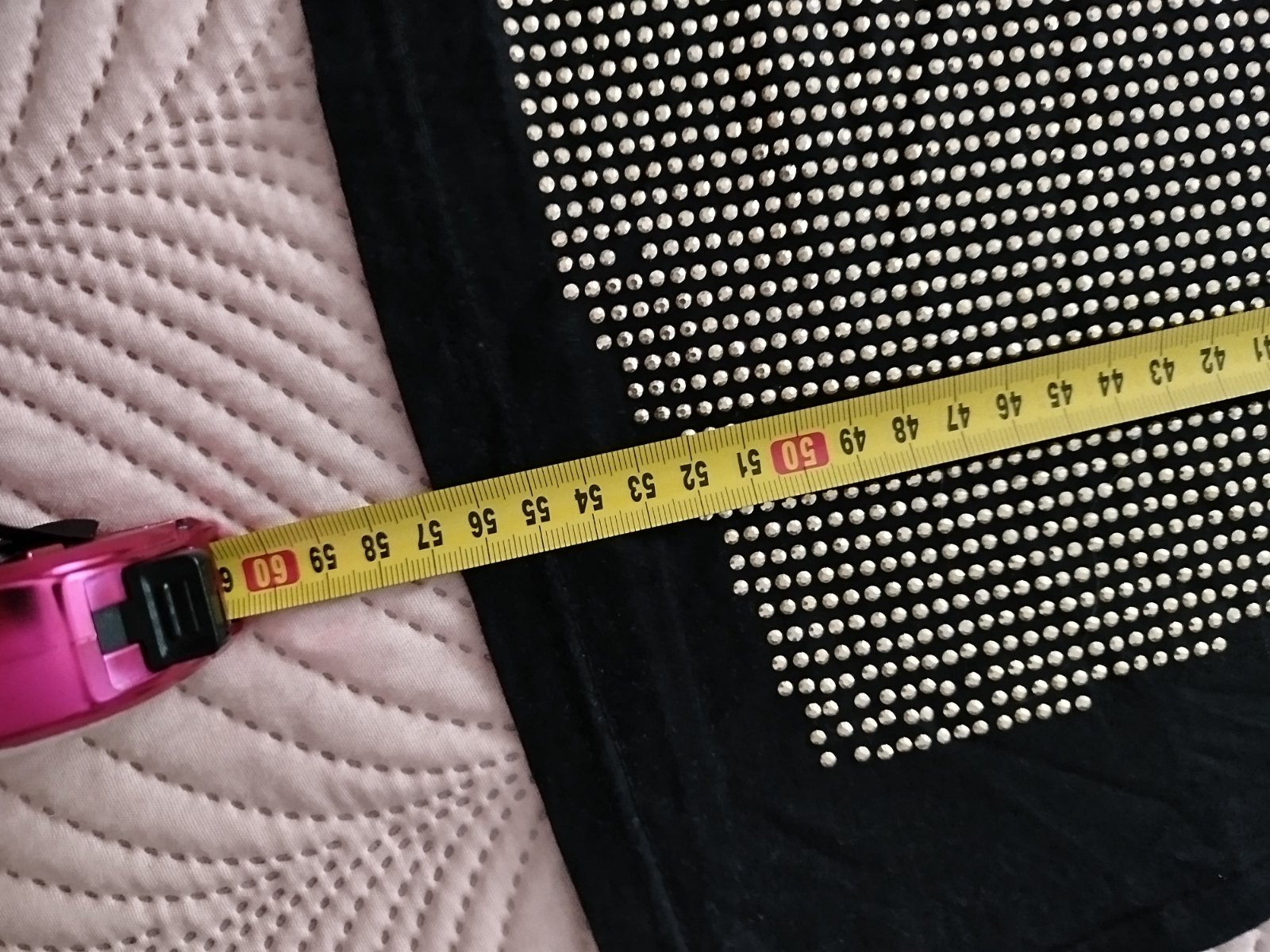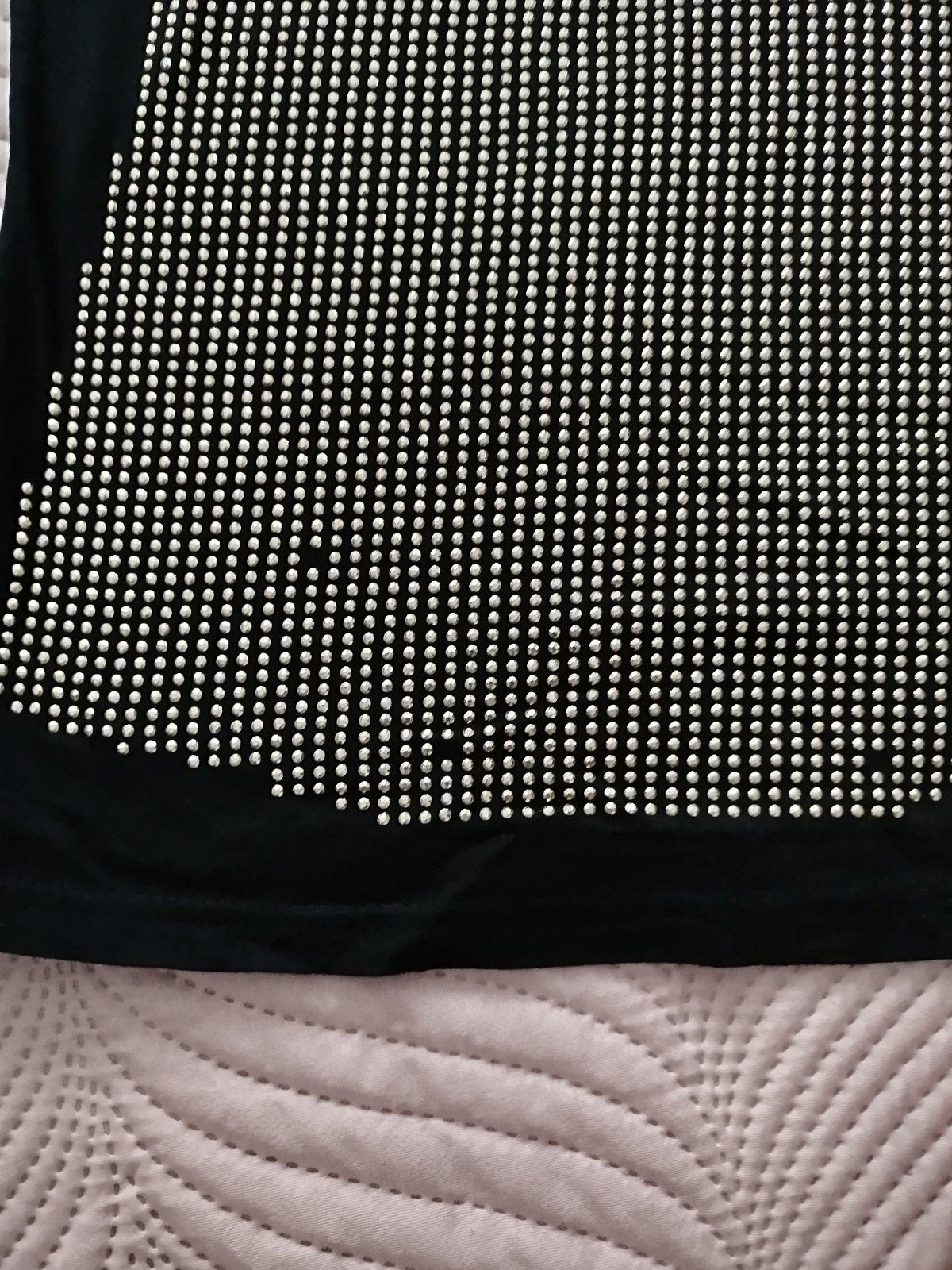 Čierne tričko, so zlatou aplikáciou, sú vypadnuté 3 kamienky, vidno na foto...