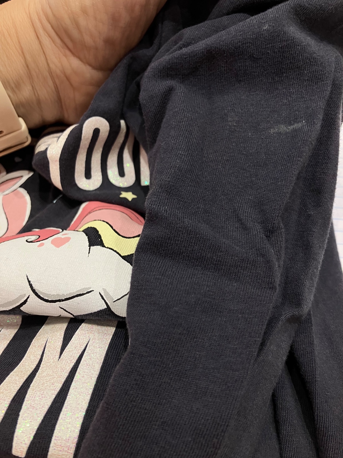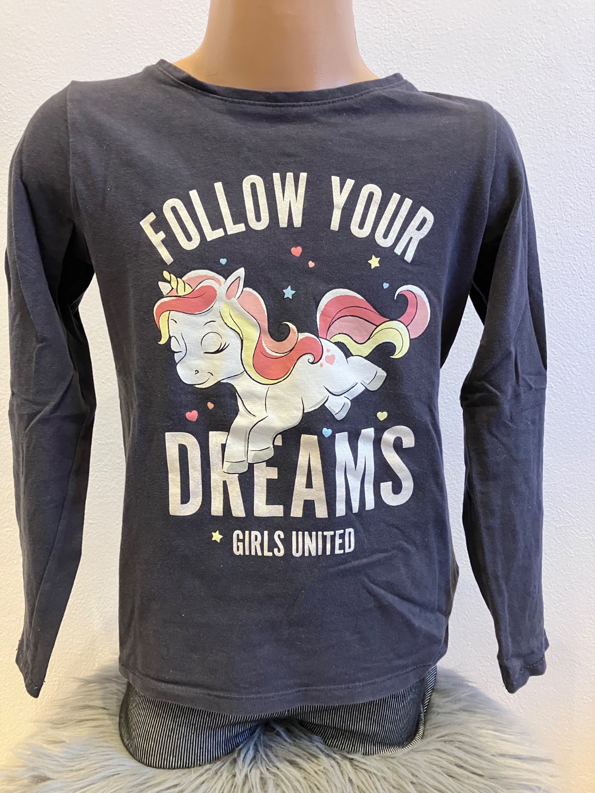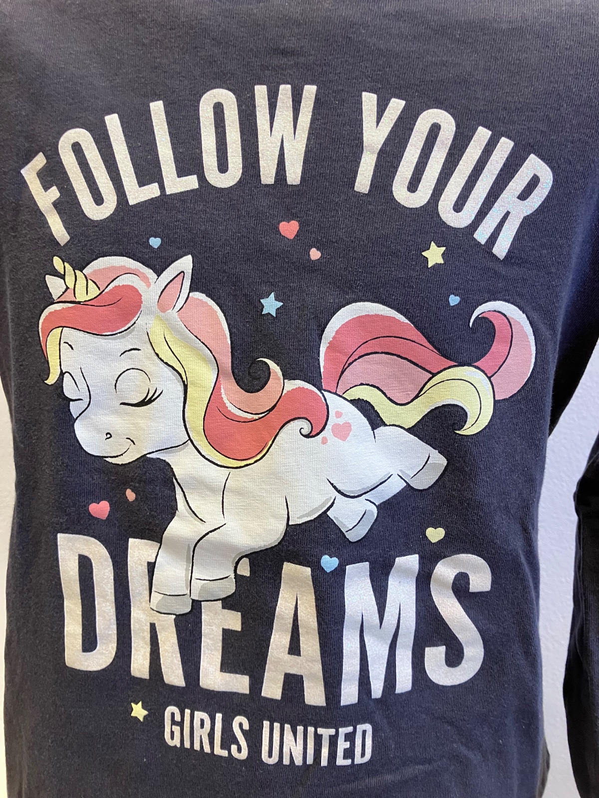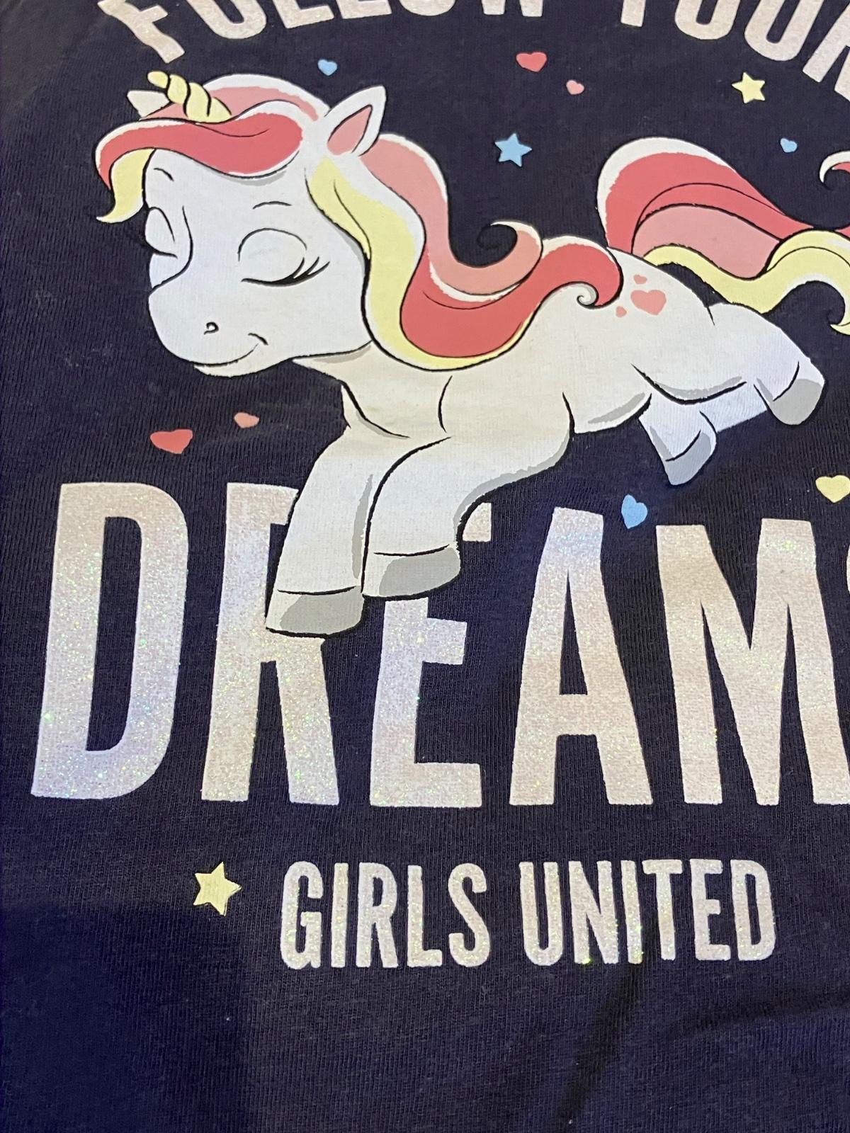 Dievčenské tričko s dlhým rukávom a potlačou jednorožec. Nápis trblietavý. Elastický.