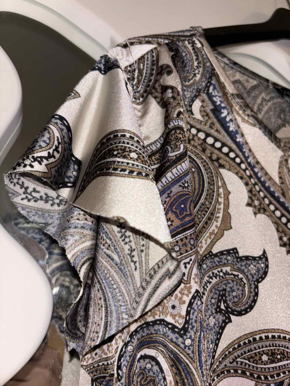 Výborný stav, pružný, nie sú obrubene rukávy, ani bočné rozparky, veľkosť 44,šírka pod pazuchami 54 cm, dĺžka 83 cm