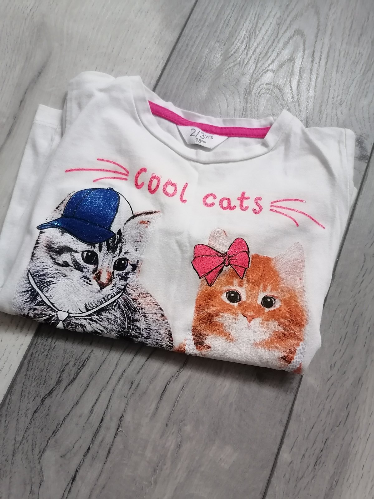 V peknom zachovalom stave. Spodok mierne natiahnutý. Mačičky sú s trblietkami, veľmi pekne tričko, do škôlky.
