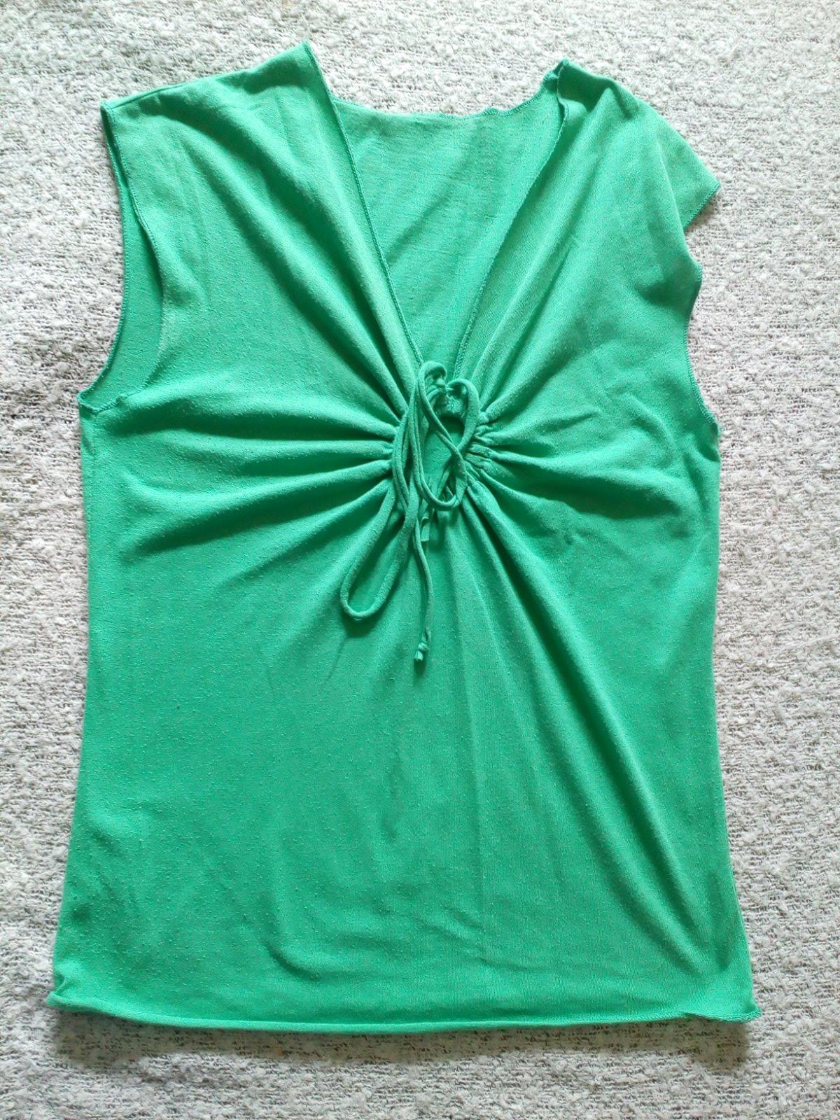 Sýtozelené tričko so zaujímavým prvkom - kruh uprostred, pekne zvýrazňuje výstrih. Semtam žmolky.