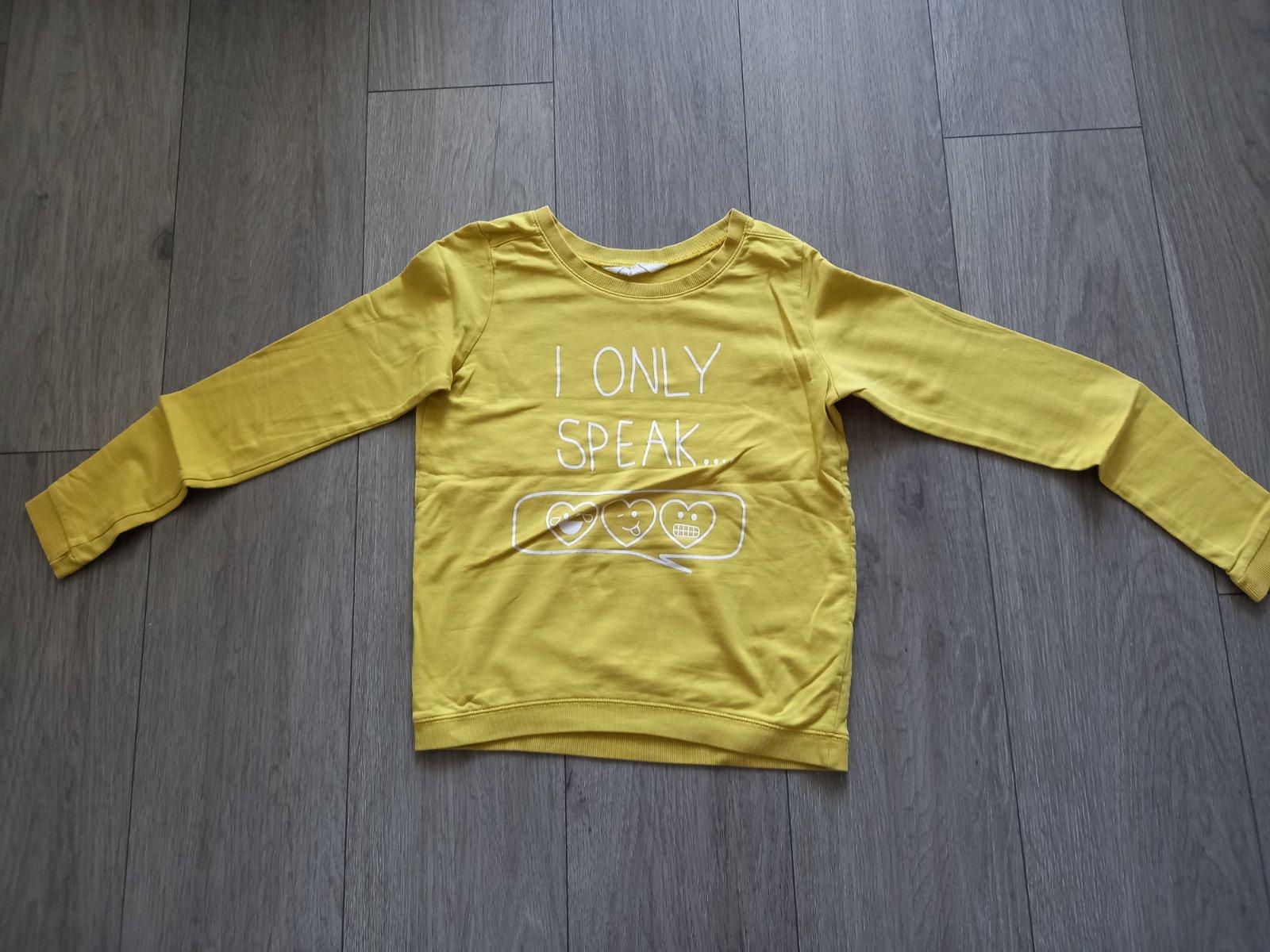 Tricko, dlhy rukav, farba je medzi tmavozltou a horcicovou, velmi prijemny material, 100 % bavlna, aplikacia trosku popraskana (len spodna cast, kde su srdiecka),