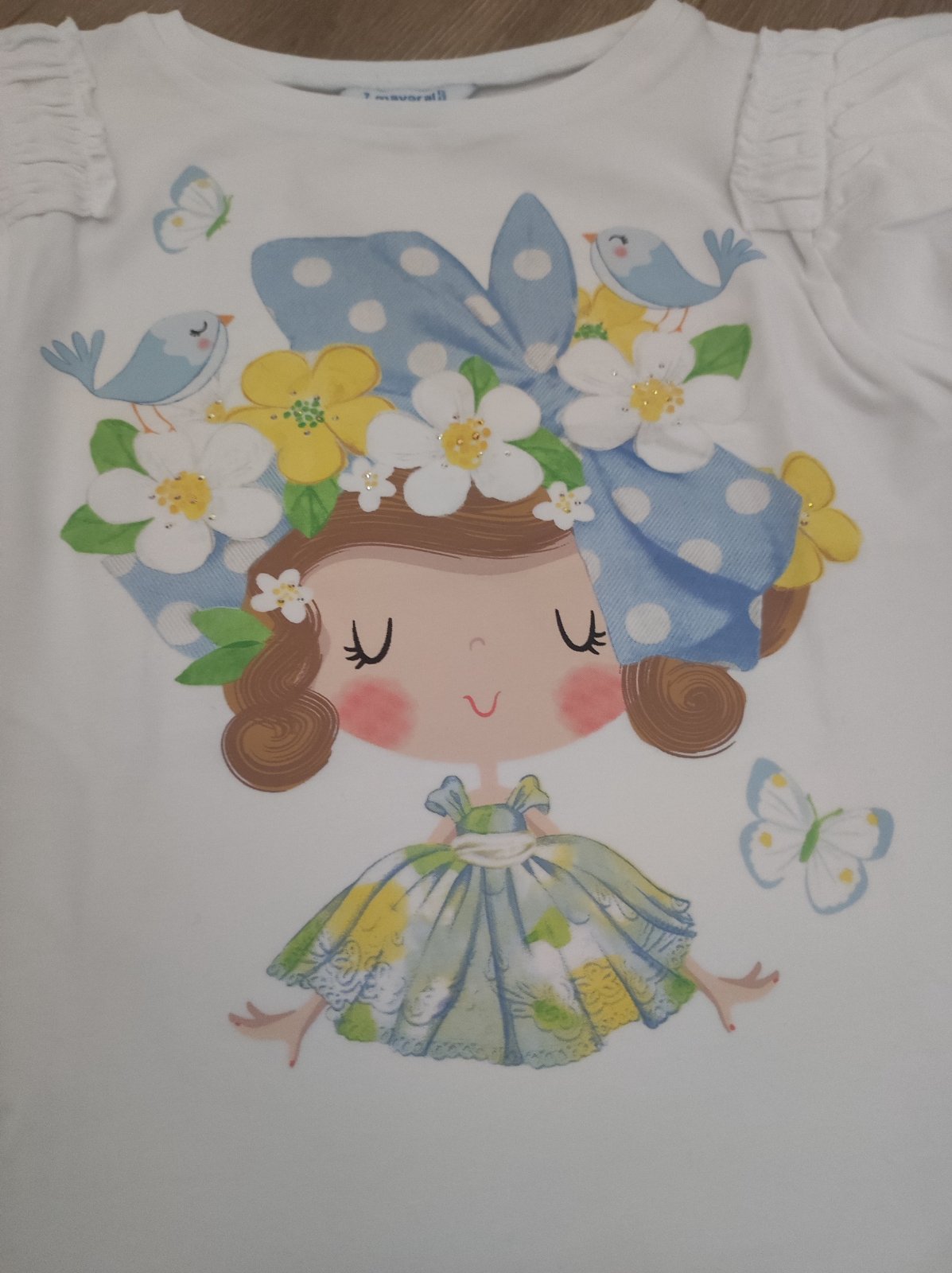 Super stav, bez fľakov, žmolkov či poškodení. Jemnučký letný materiál. Vpredu aplikácia košíka s kvetmi, ozdobná čipkovaná stužka s mašľou, 3D margarétka. Okolo rukávov jemnučká mušelínová ozdoba.