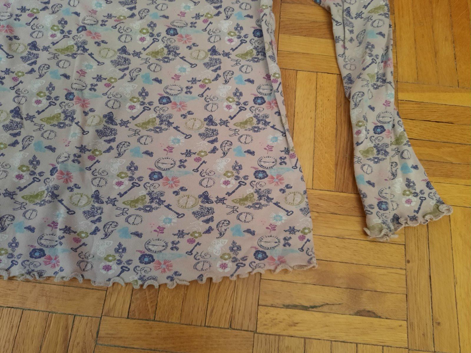 Krásne kvalitné bavlnené tričko, super materiál, elastický. Rukávy aj spodok sú ozdobne olemované. Pri ramenách mierne nariasené.