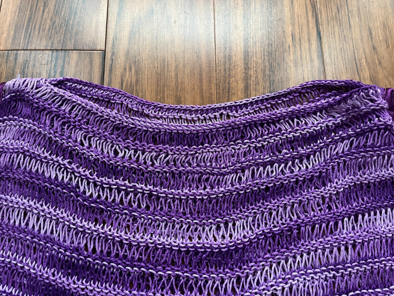 Predám ručne pletený top, fialová melírovaná priadza, spúštané očko. Rukáv a spodný lem obšitý saténom. Spodný lem uväzovanie na mašlu. Celková dĺžka 68cm, šírka 48cm.