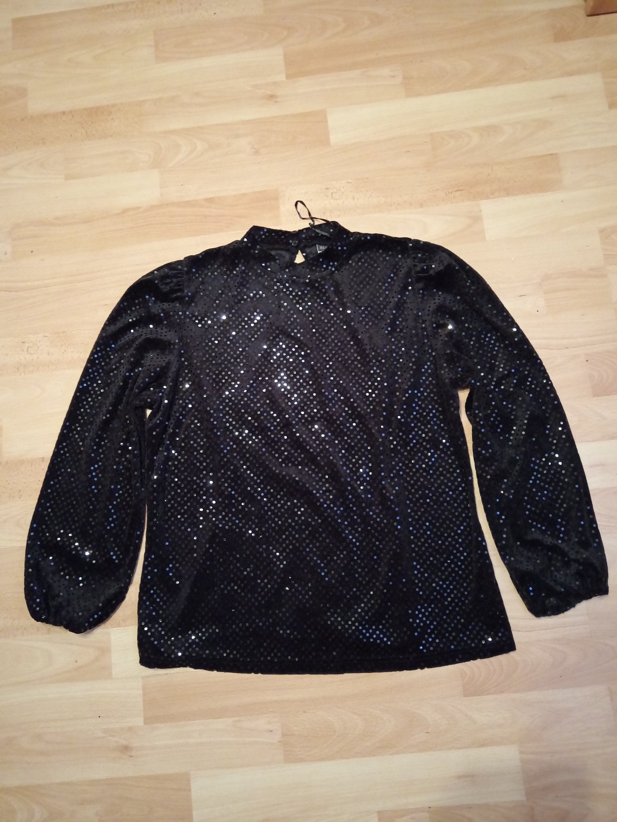 Pekný predlžený dámsky top čiernej farby s kamienkami, príjemný pružný materiál, šírka pod pazuchami 54-56 cm, celková dlžka 68 cm, top stav