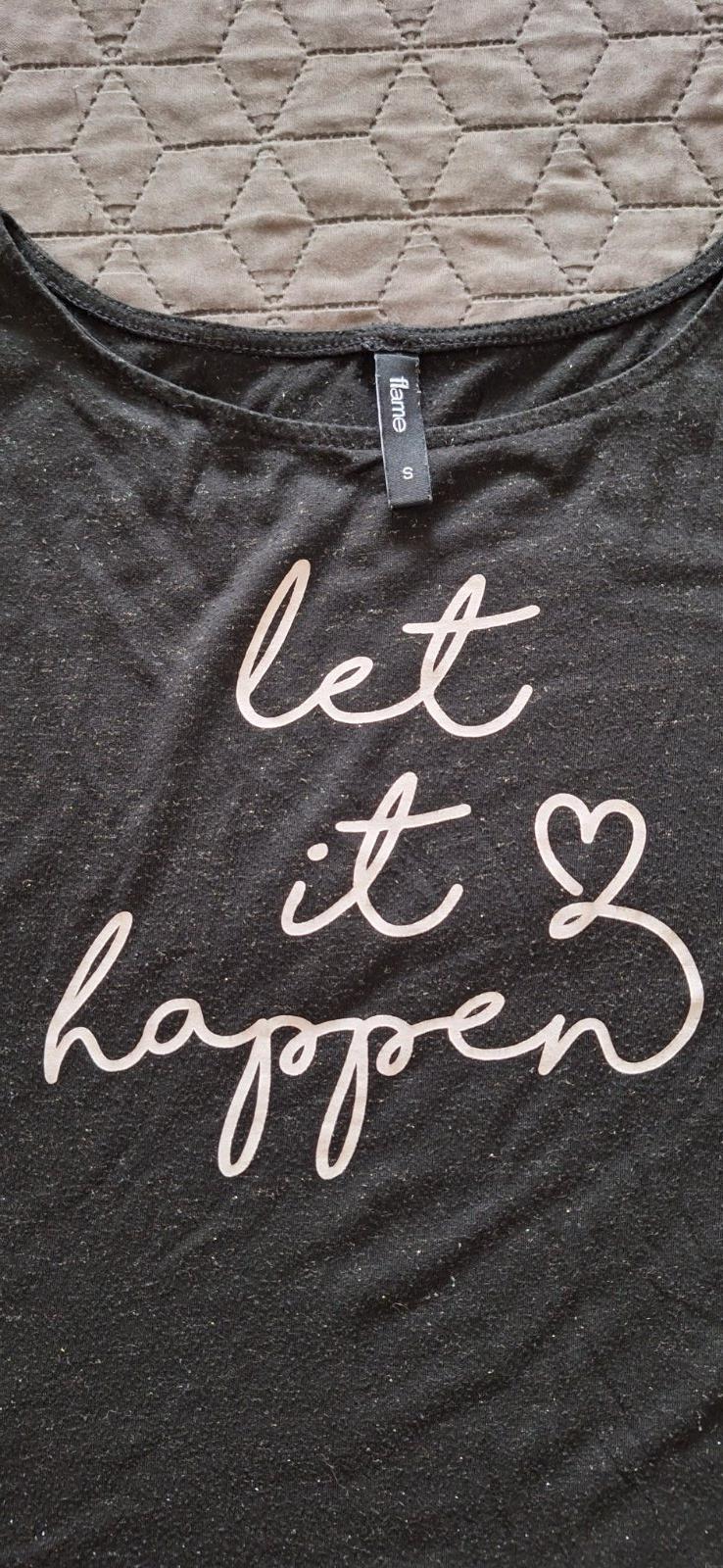 Tričko s napisom Let it happend, tmavoseda farba, skoro az cierna s trblietavou nitou. Velmi dobry stav