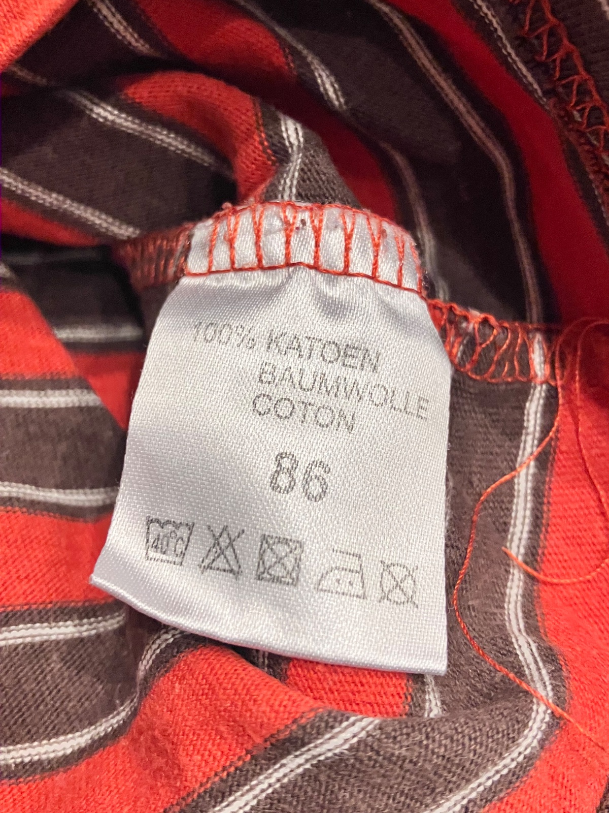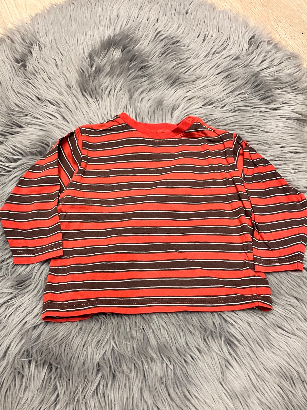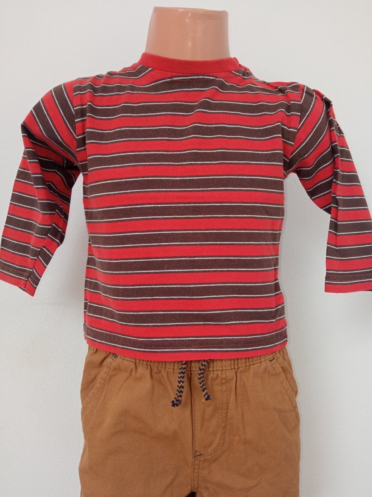 Chlapčenské pásikavé tričko s dlhým rukávom, zapínanie na ramene na tri cvoky, elastické, materiál 100%bavlna, farba: červeno-tmavohnedá.