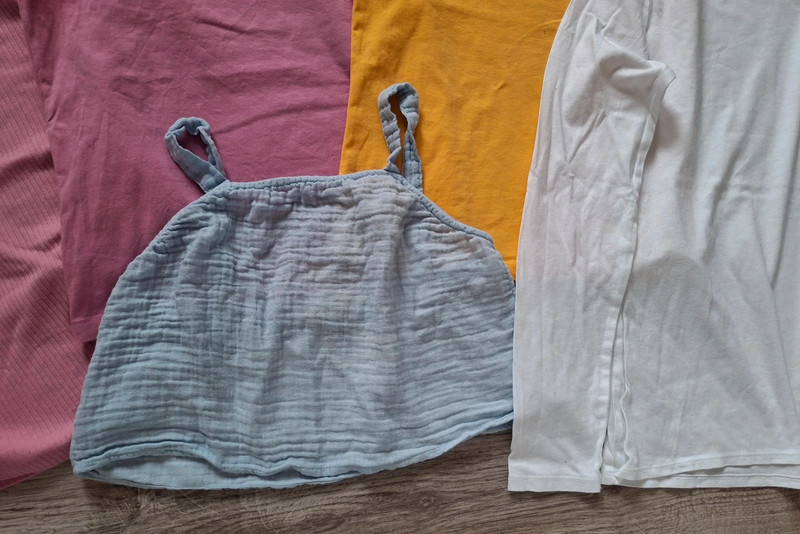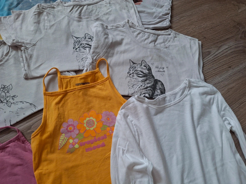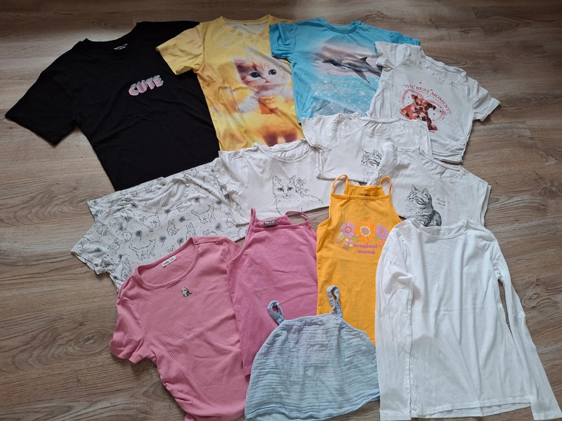 Všetky tričká pepco 158/164, fčierne úplne nové, arebné tričká boli iba oprané, viac nenosené, ostatné oblečené párkrát, bez poškodenia, iba jedno biele a modré majú malý takmer neviditeľný fliačik, biele tričko s dlhým rukávom kupované v Decathlone, raz oblečené, v 100% stave. Cena za všetkých 13 ks spolu 7 eur.