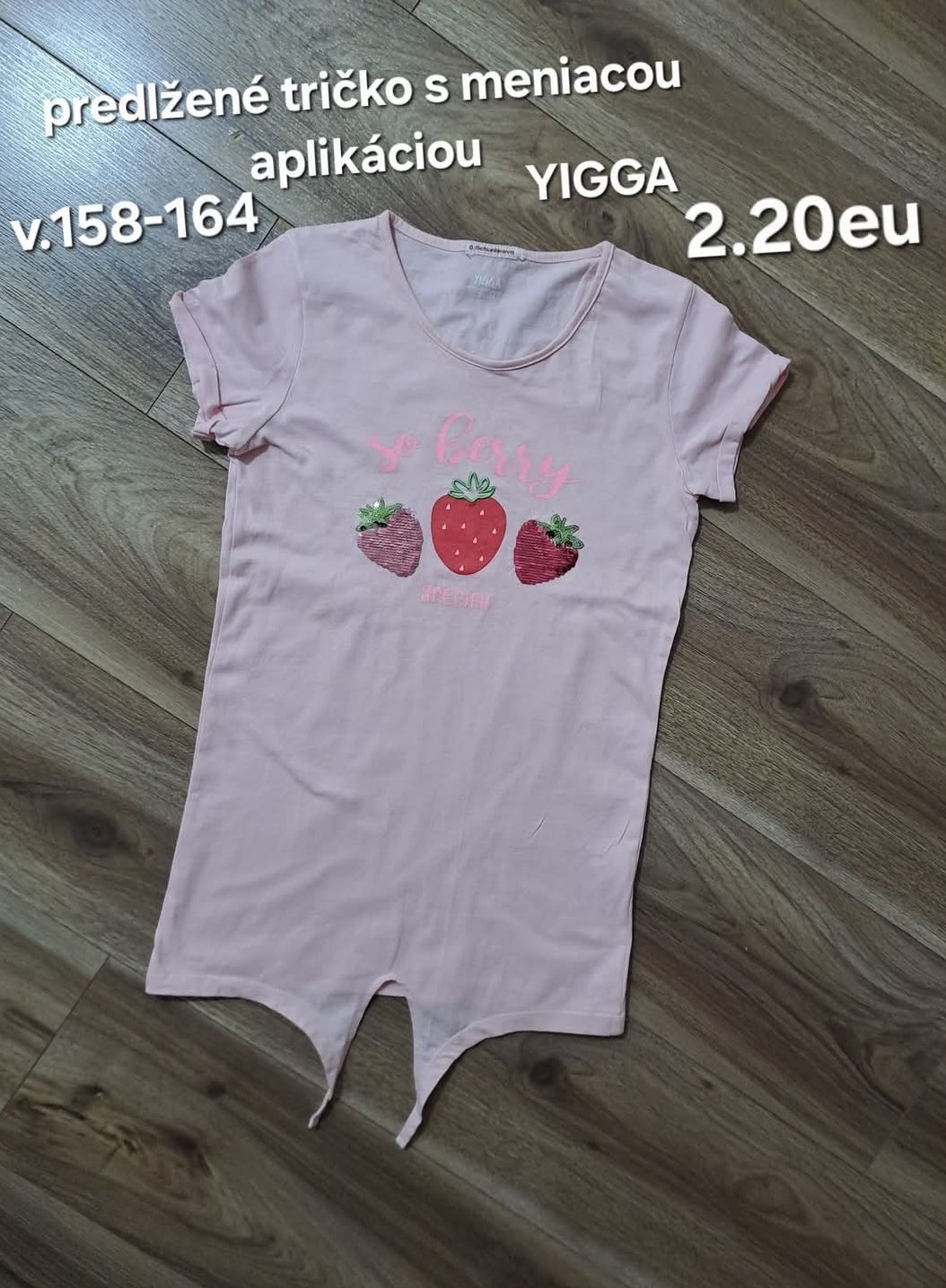 Predám dievčenské tričko veľkosť 158/164 s čipkou na spodnom leme hrudník 2 x 43 cm pás 2 x 41 cm boky 2 x 44 cm dĺžka 57 cm rukáv od krku 65 cm