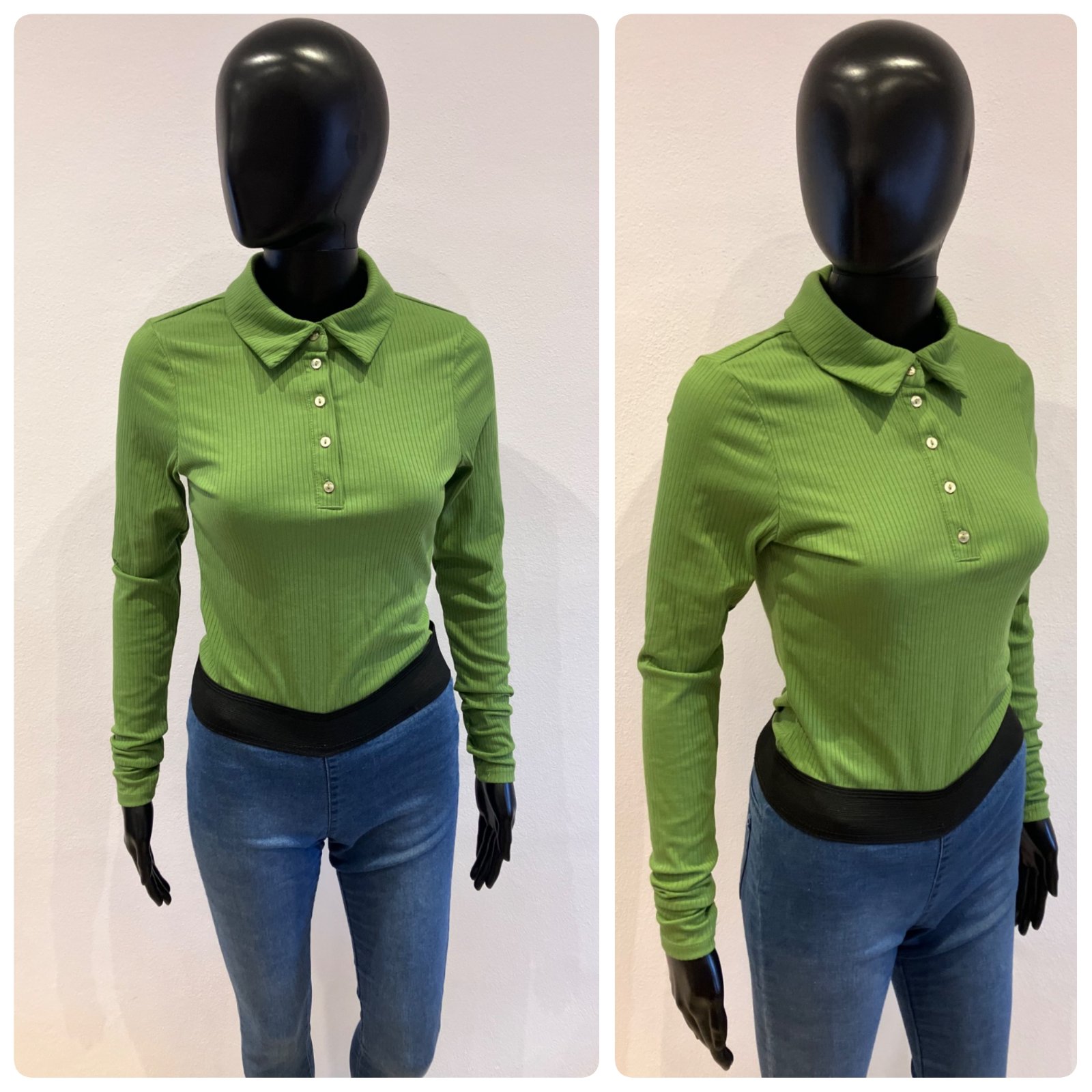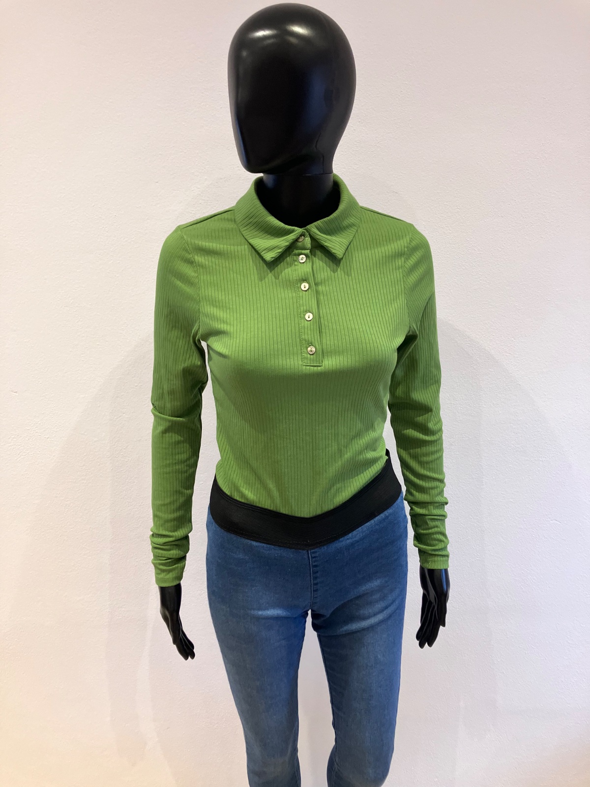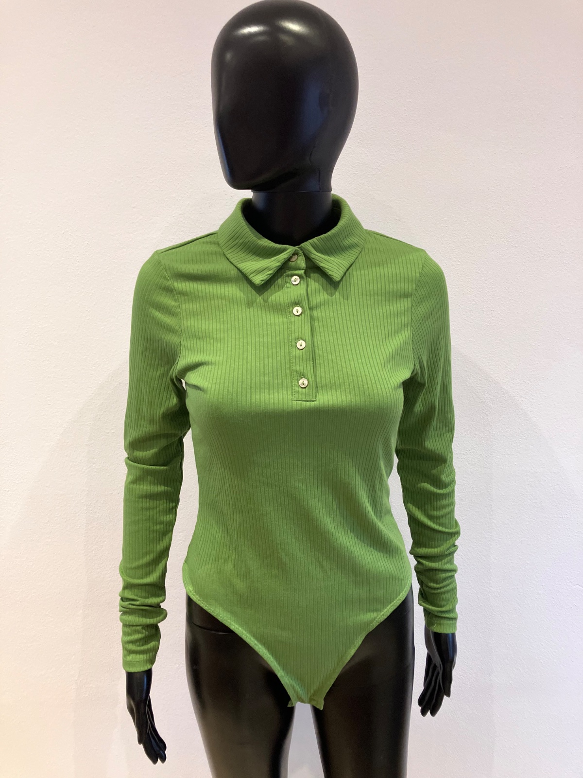 Dámske zelené body s dlhým rukávom, golierom a gombíkmi, rebrované, tenké, elastické, v spodnej časti sa zapína na cvoky, materiál 65%polyester 28%viskóza 7%elastan.