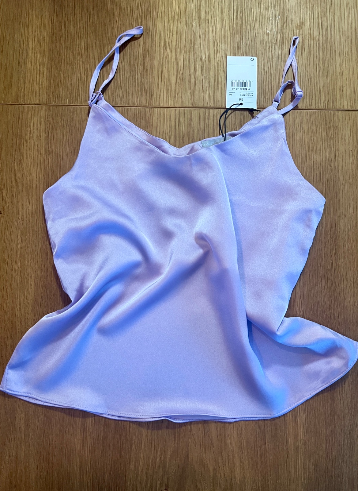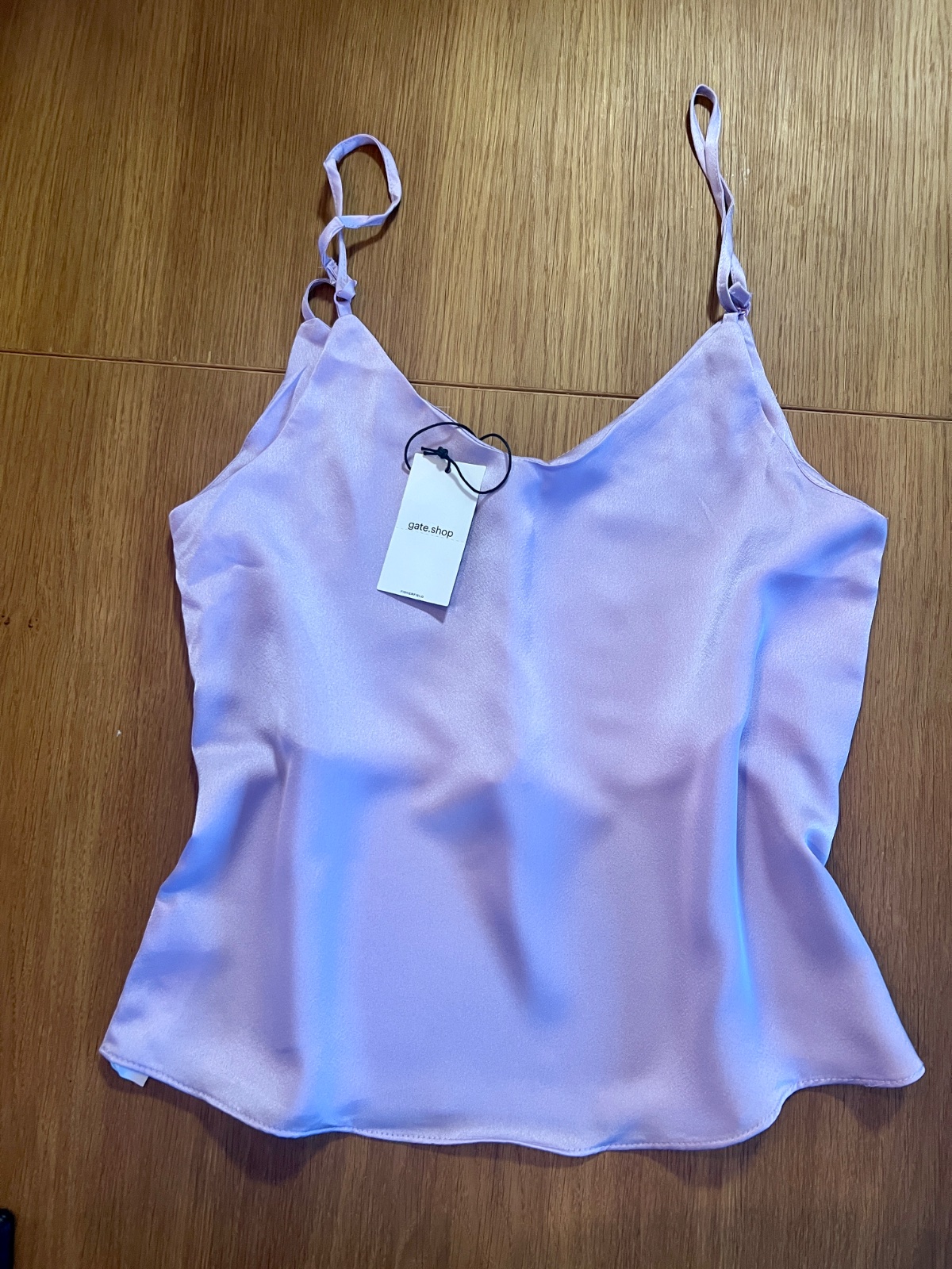 Nový saténový top na ramienka, krásna bledofialová farba, voľný strih a príjemný materiál. Ramienka sa dajú nastaviť. Veľkosť 36. Značka Gate.