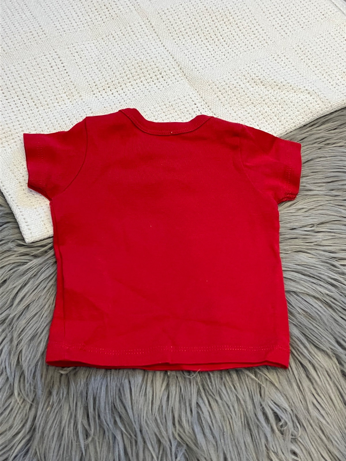 Chlapčenské tričko s krátkym rukávom, červené s bielou potlačou, elastické, zapínanie na ramene na dve cvoky, materiál 100% bavlna.