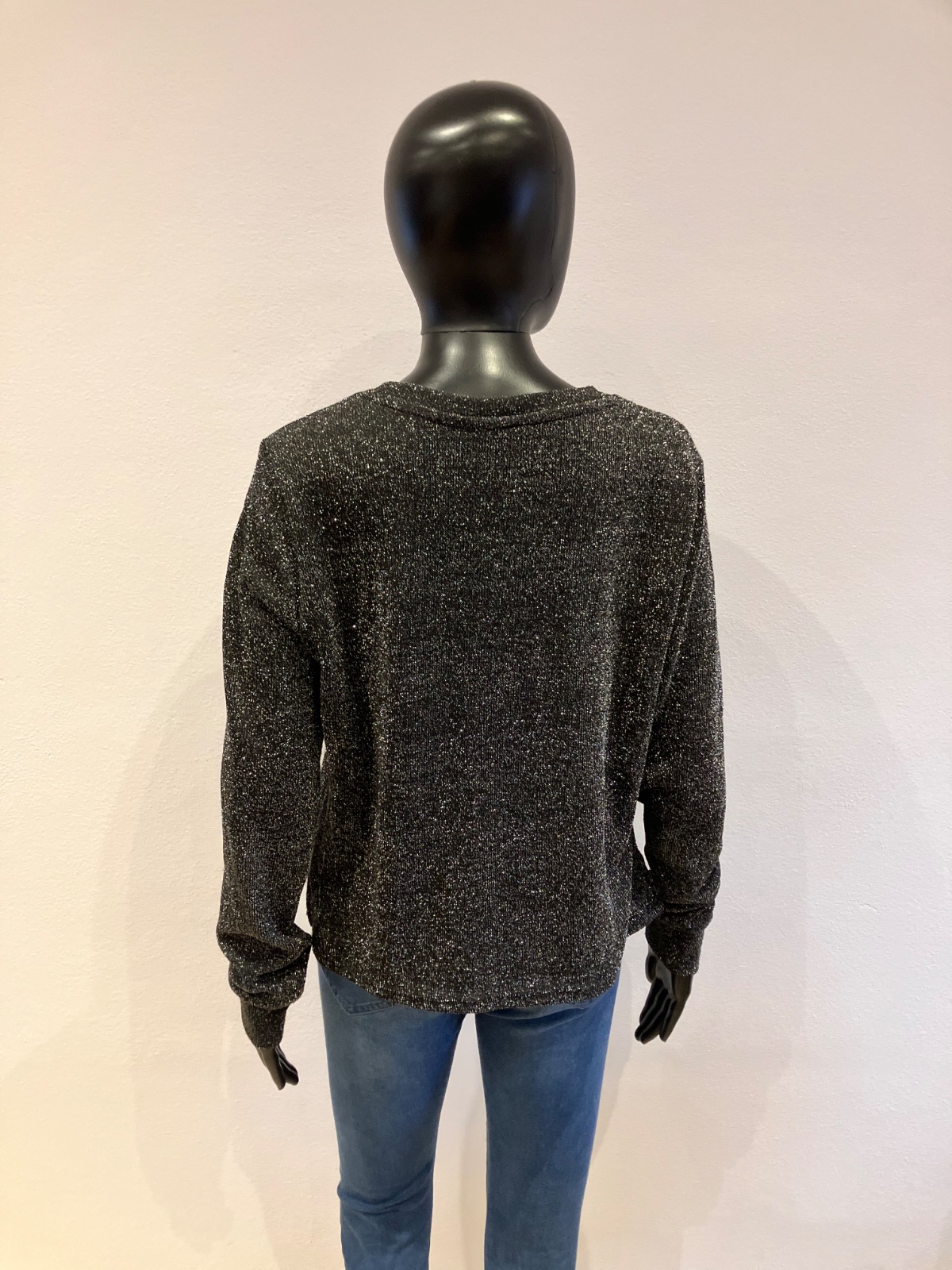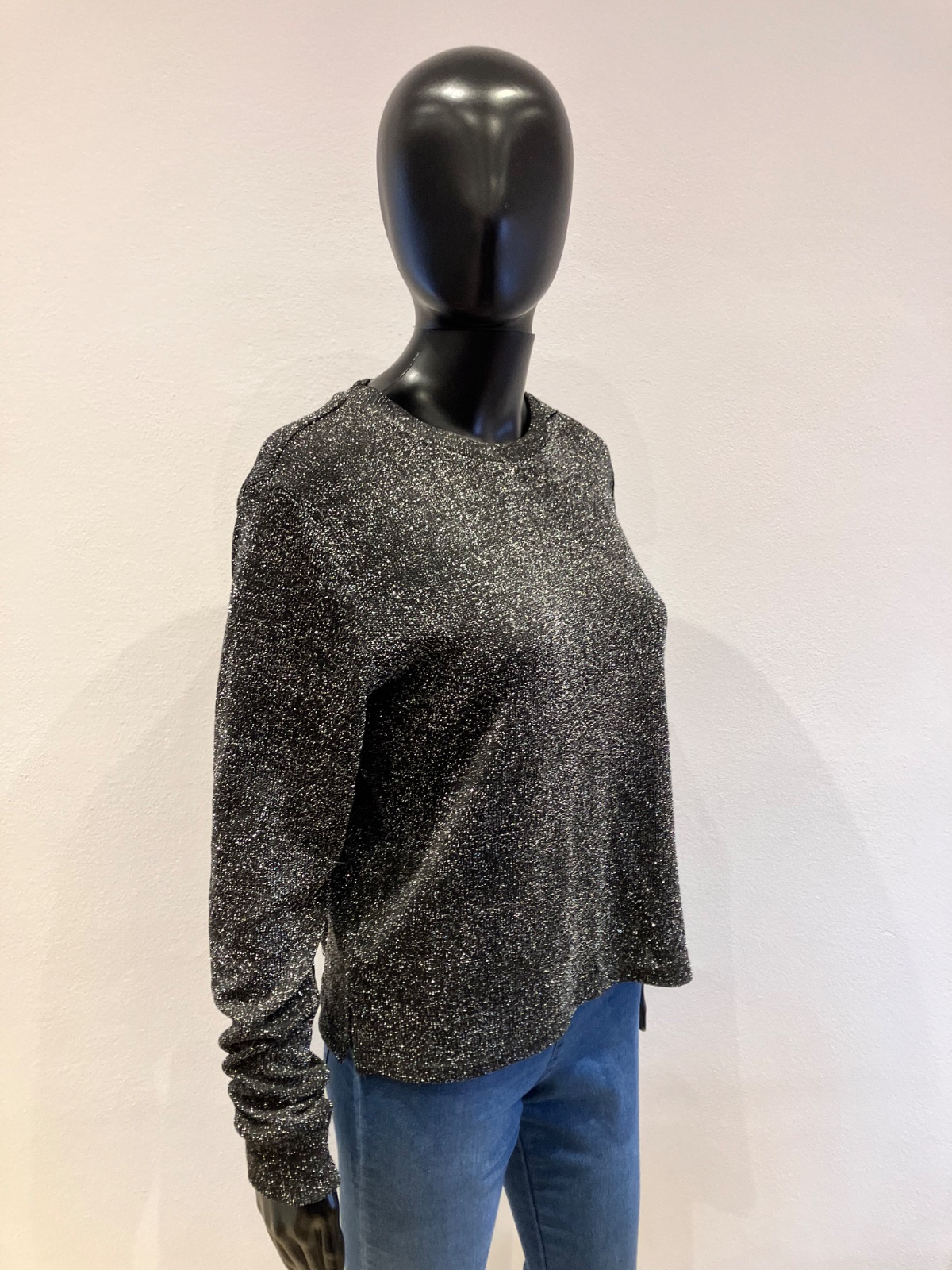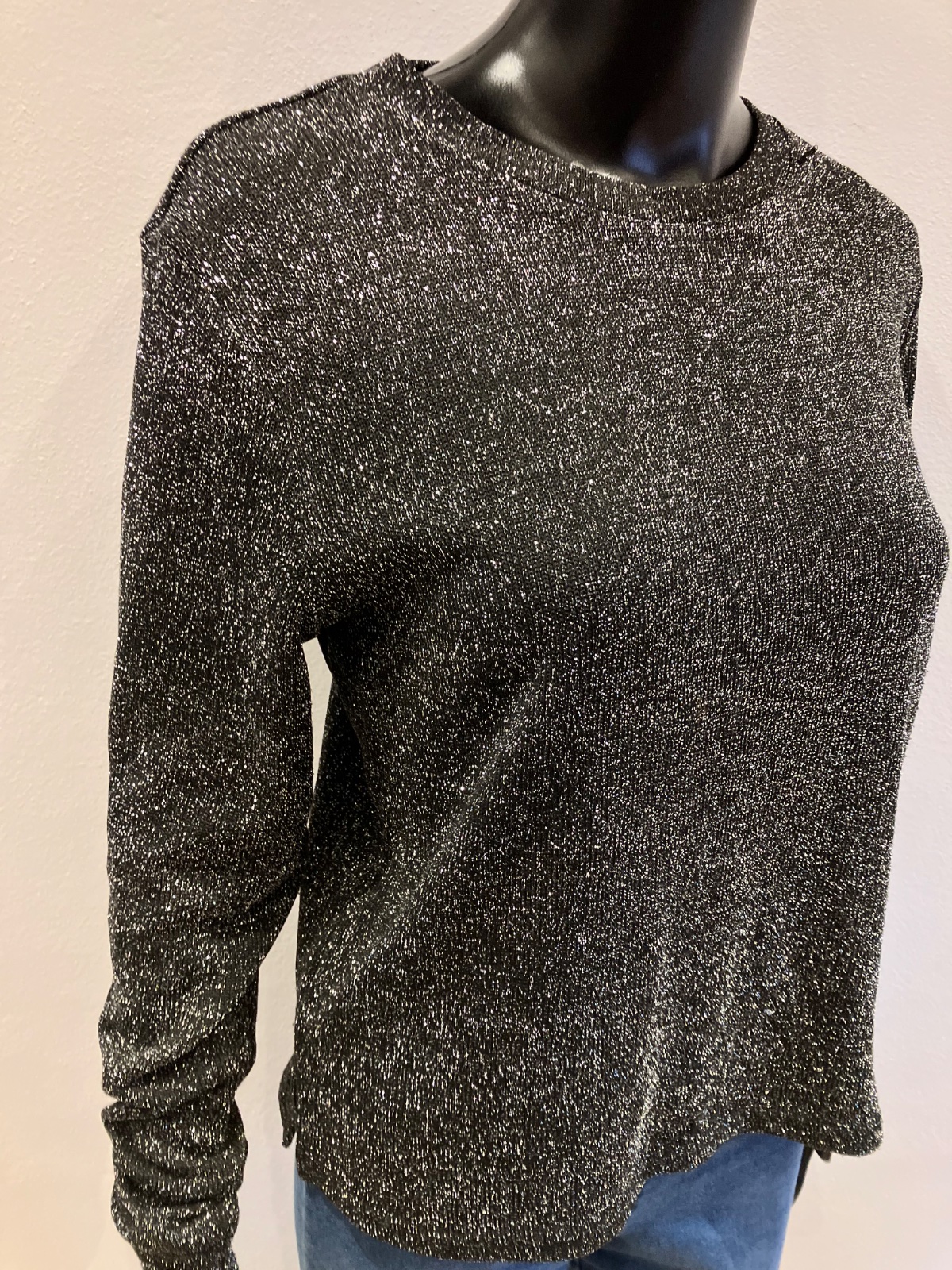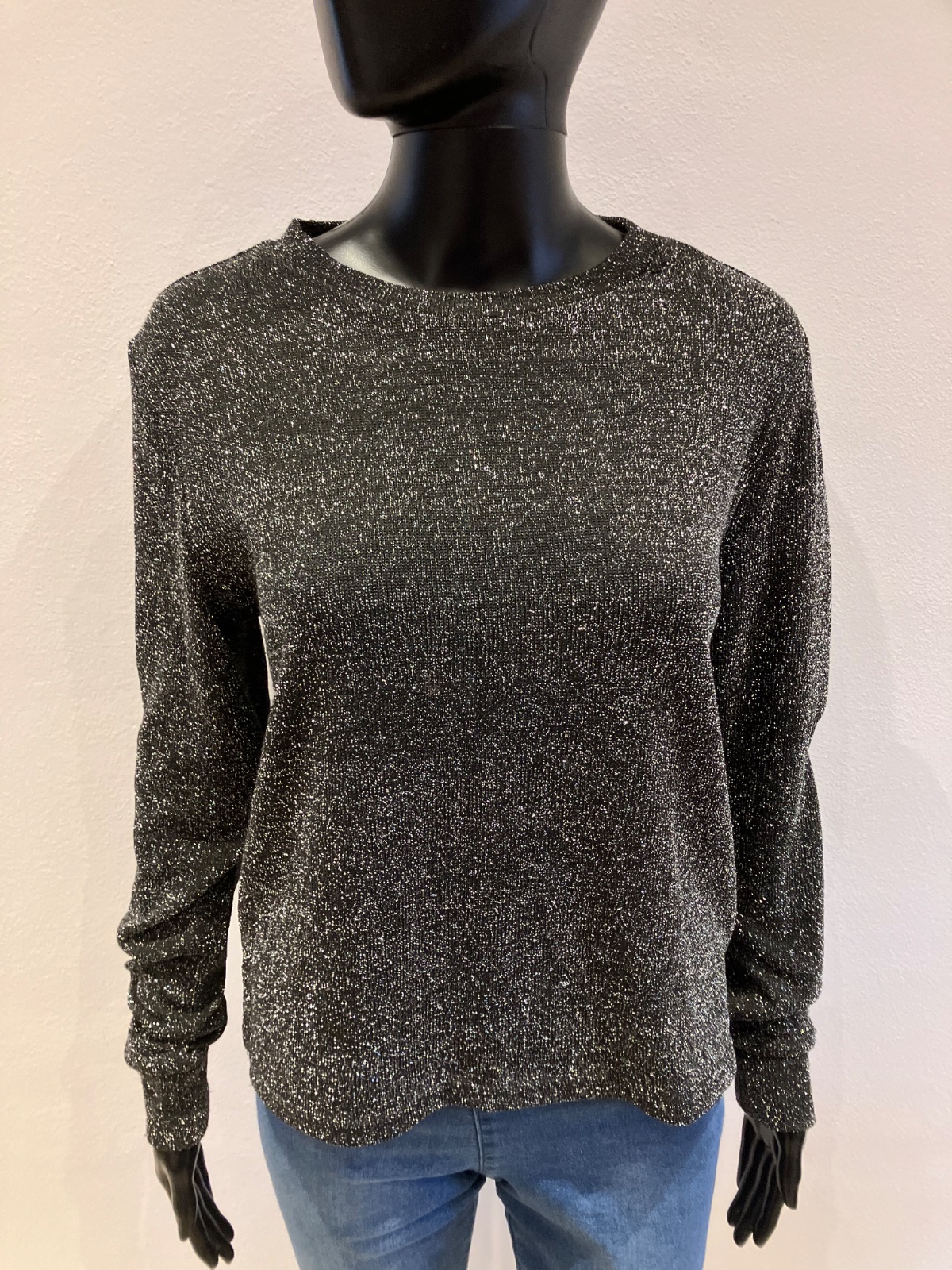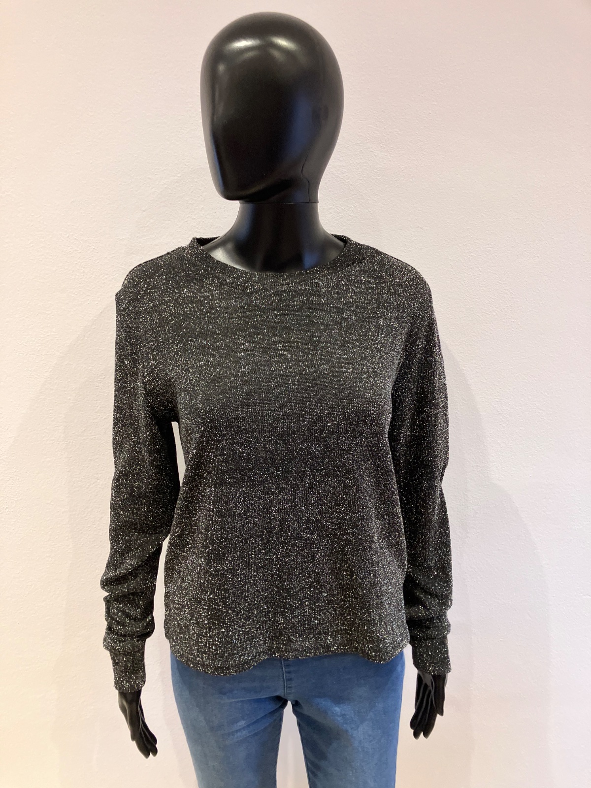 Dámska lesklá blúzka s dlhým rukávom, okrúhly výstrih, tenká, elastická, materiál: vrchný materiál 93%polyester 5%metalizované vlákno 2%elastan.