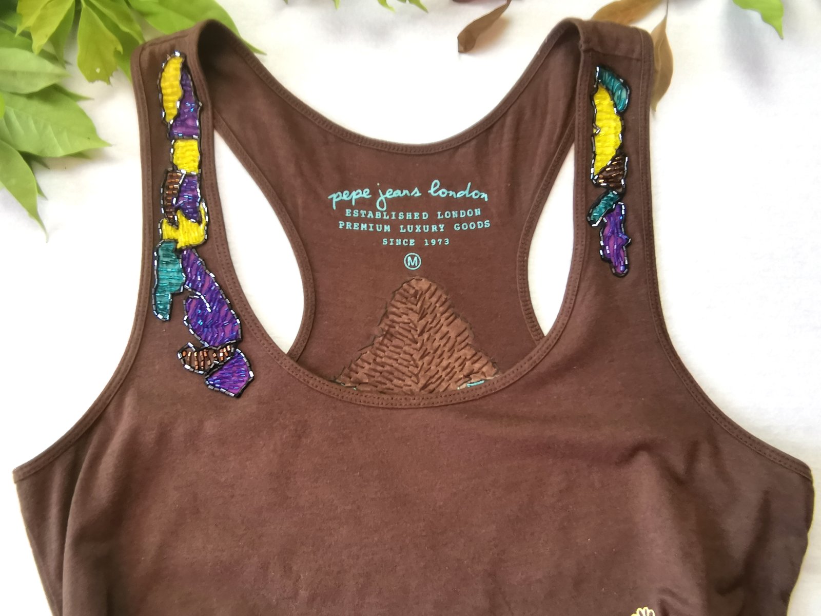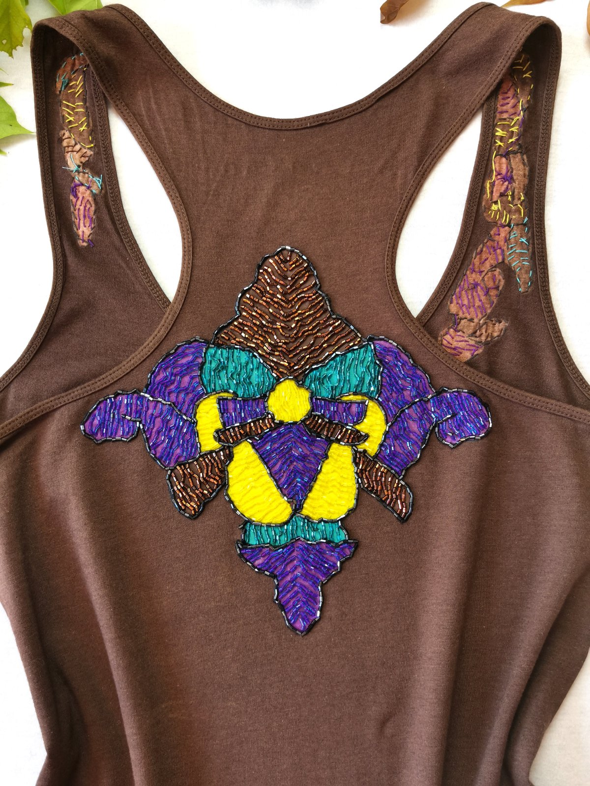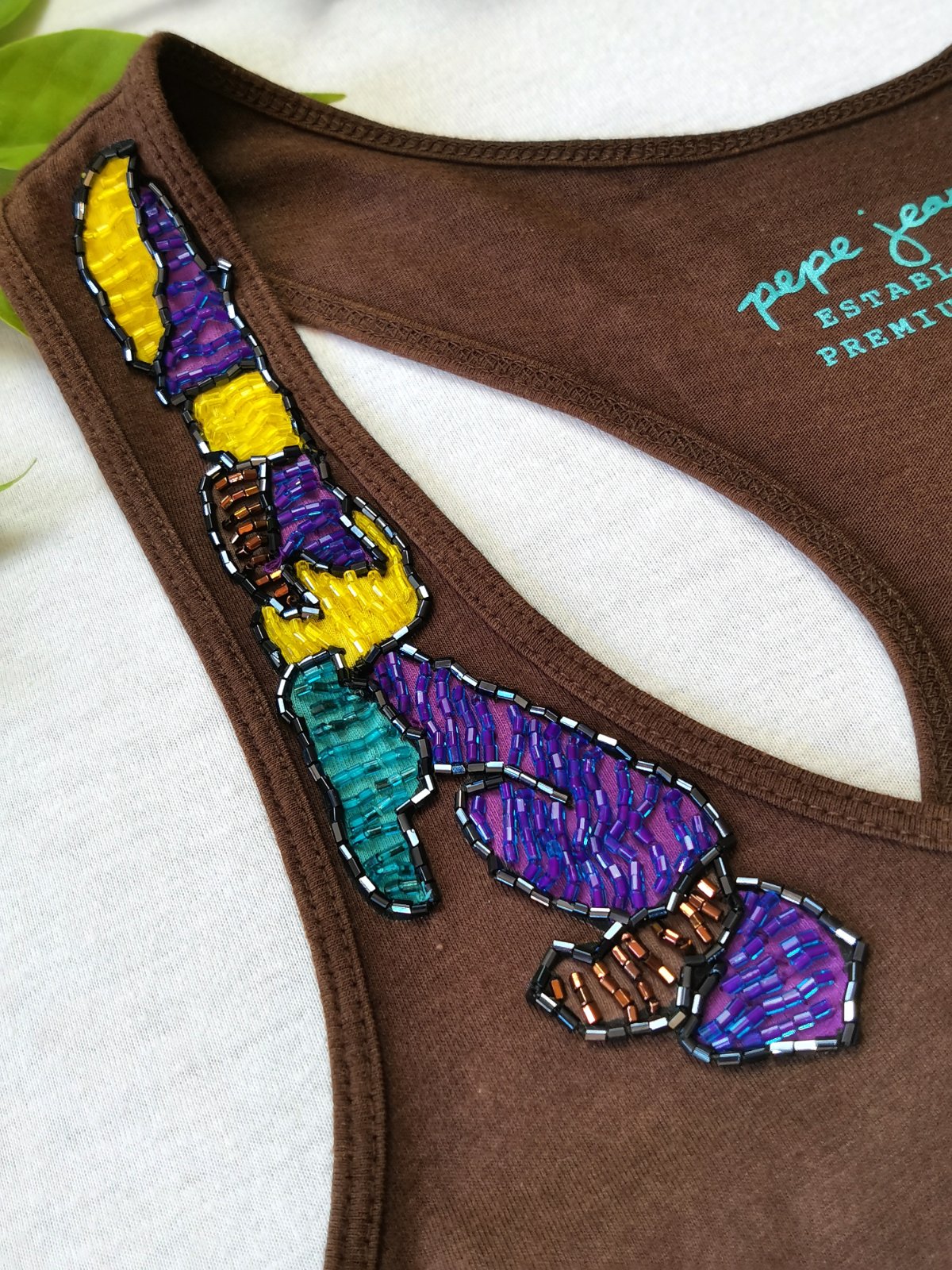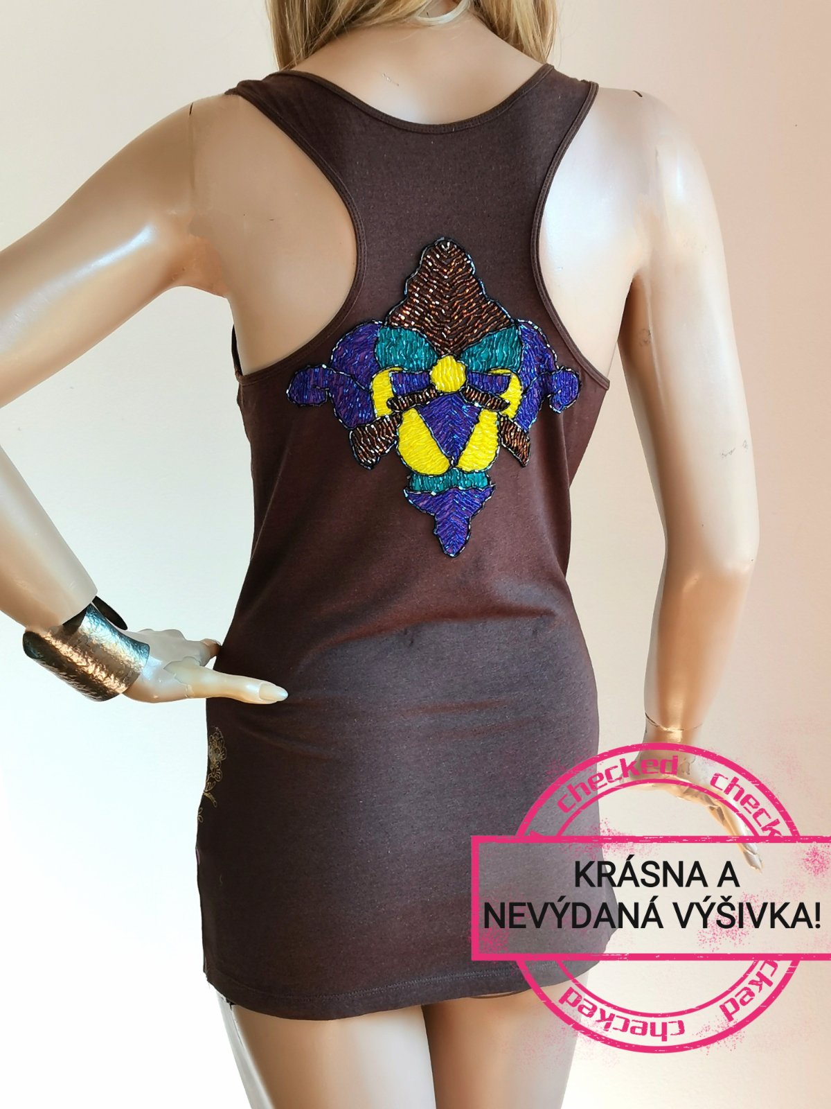 Na ramenách a chrbátiku má čarovnú výšivkou z korálikov. V predu veľký zlatý ornament.