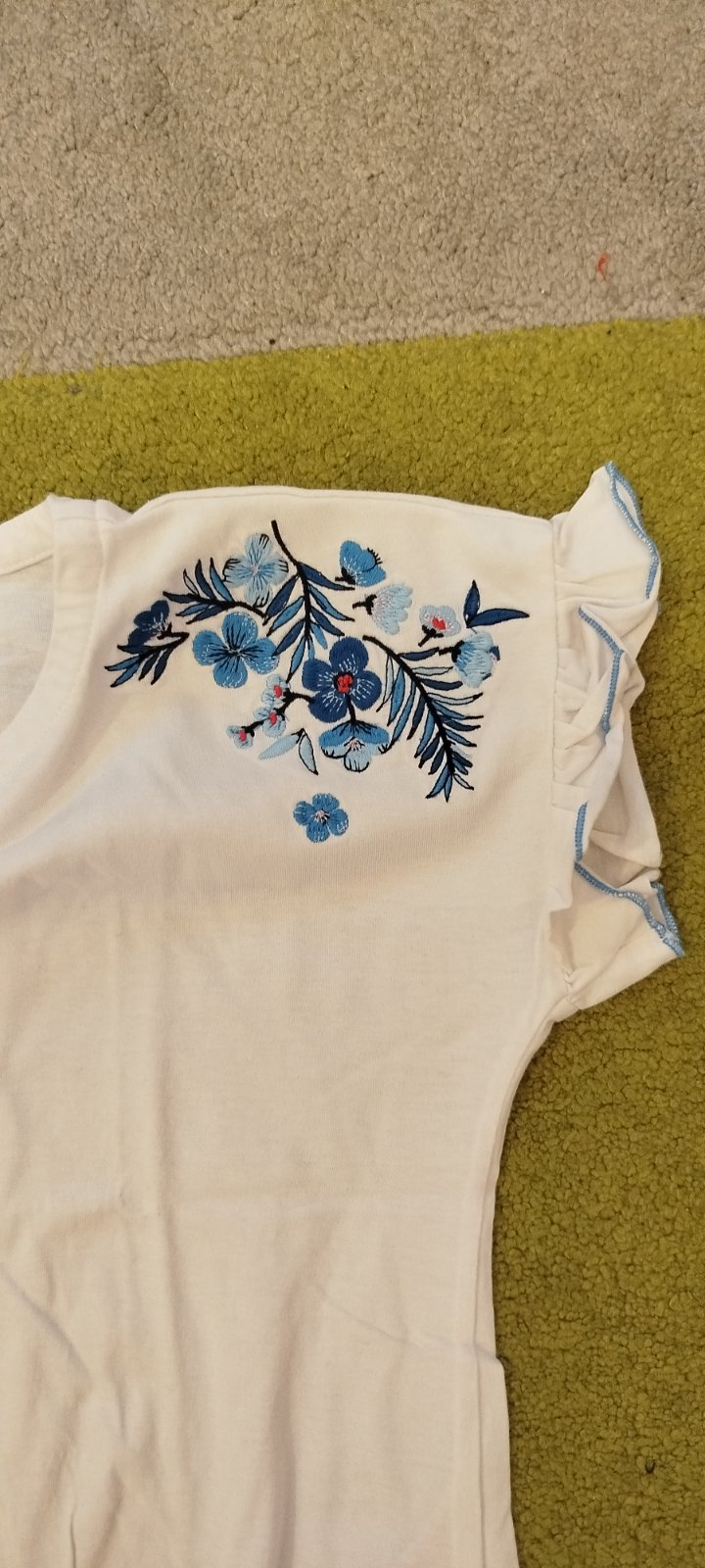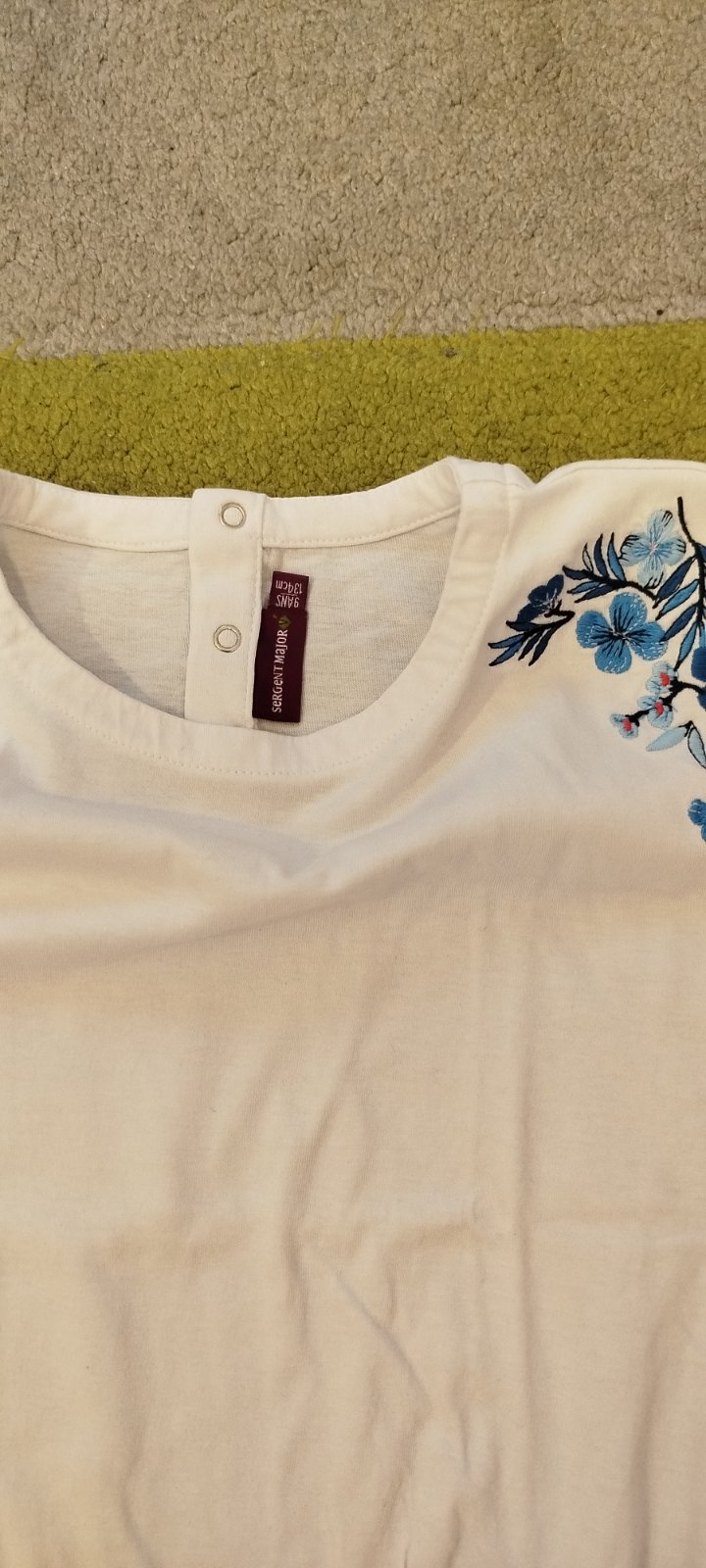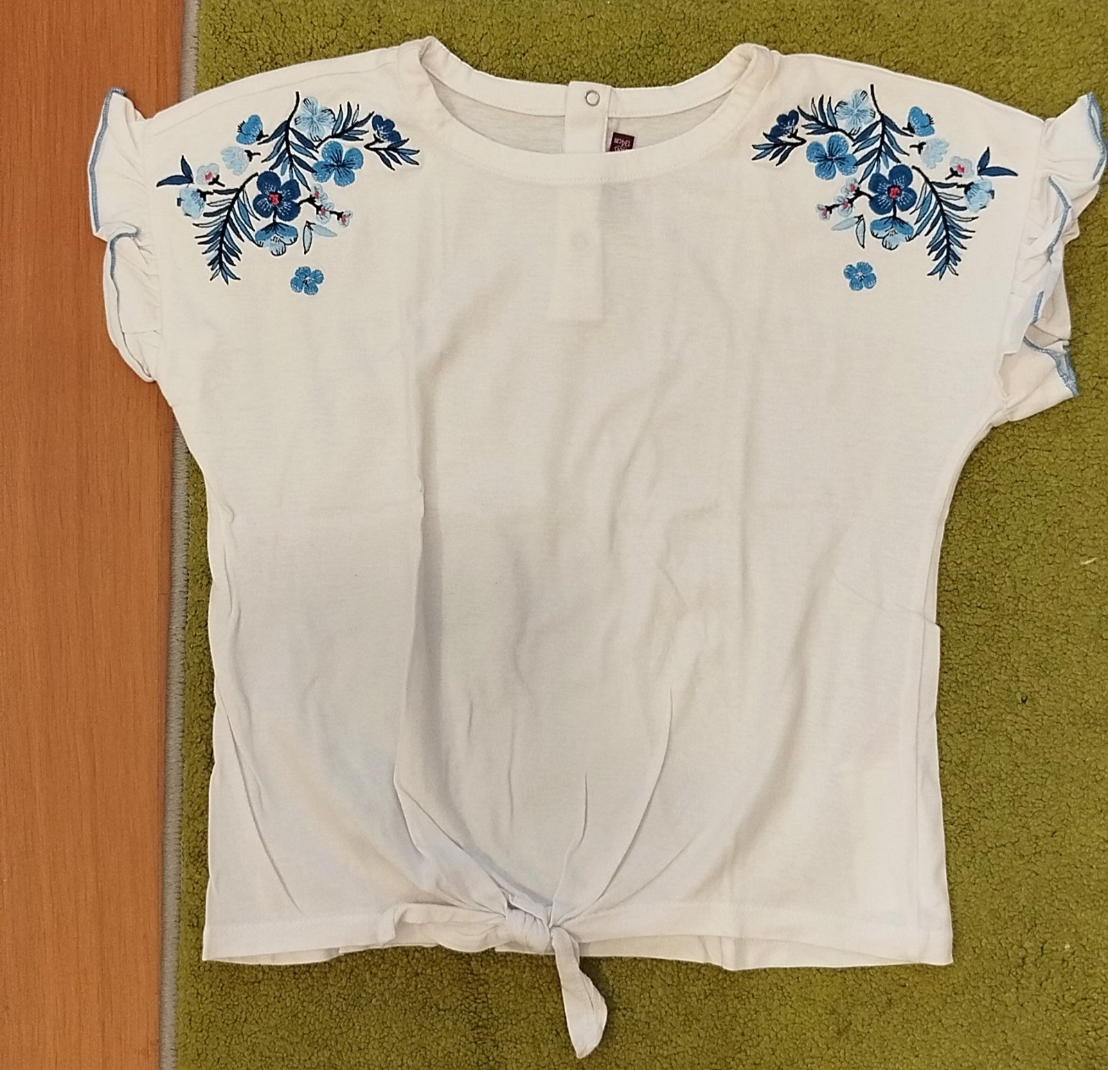 Biele tričko- blúzka z kvalitnej bavlny, prefektný strih, krásna výšivka, veľmi prijetmne na nosenie. Dcérka ho mala 1x oblecene na fotenie, do leta jej bolo malé.