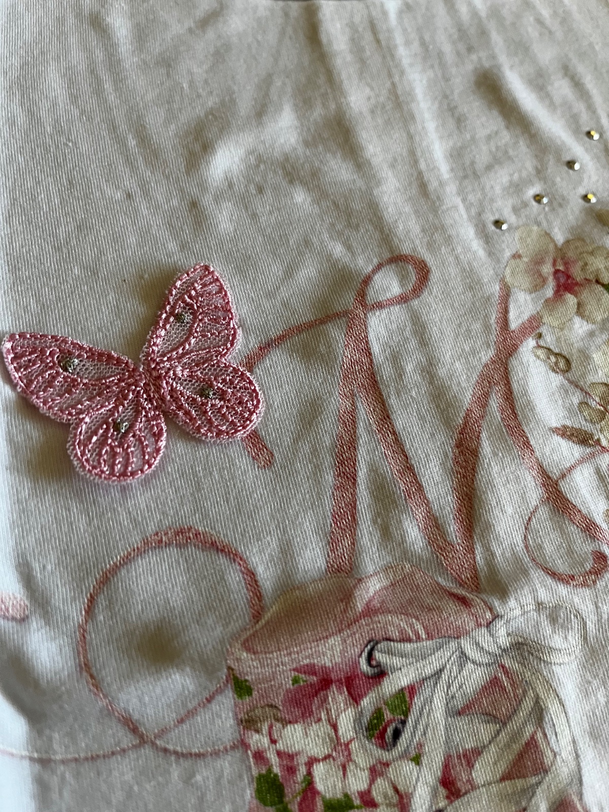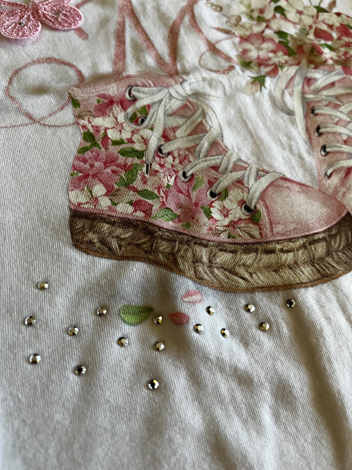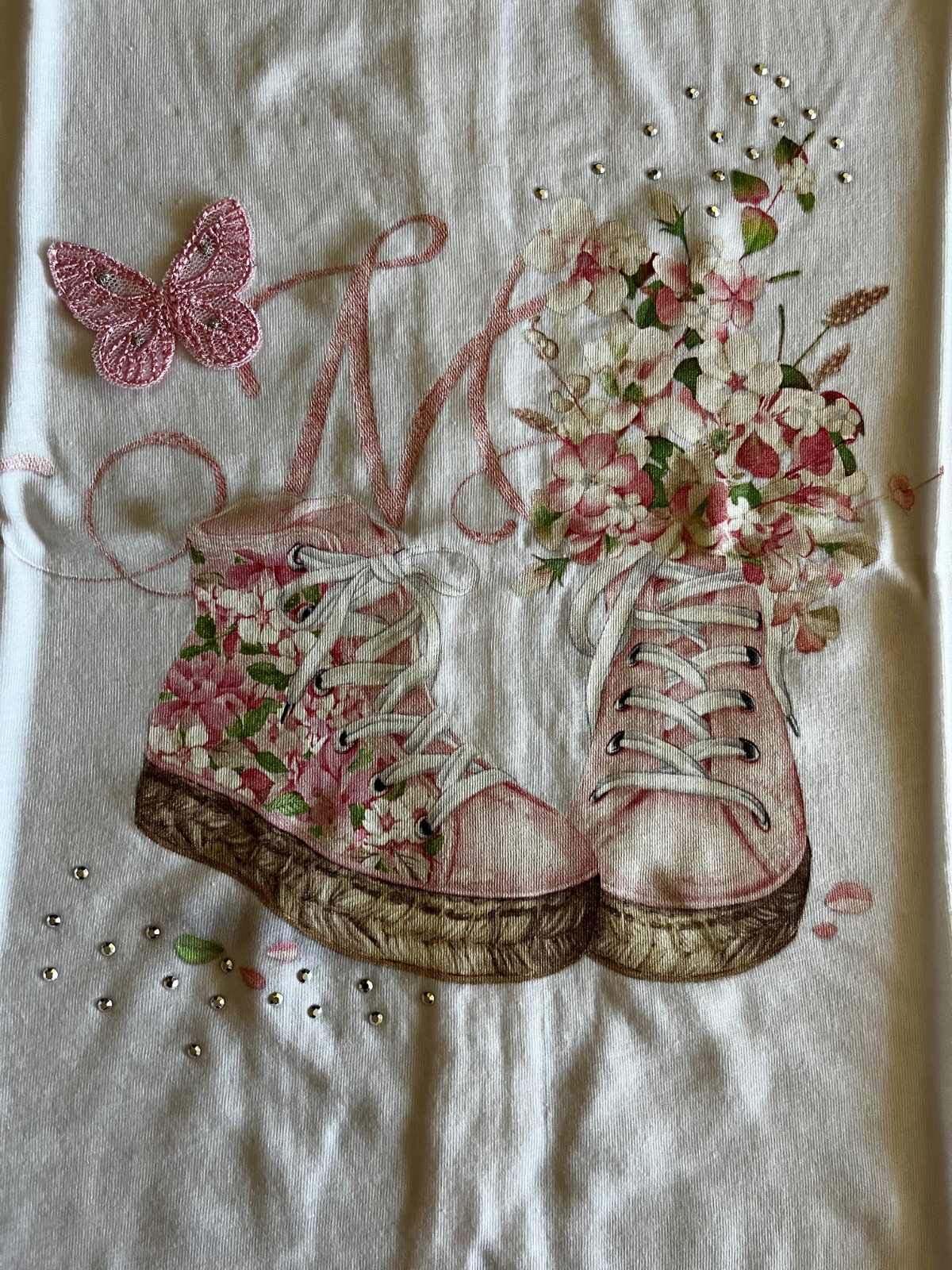 Vpredu krásna aplikácia s 3D motýlikom a teniskami, lesklé strieborné kamienky.