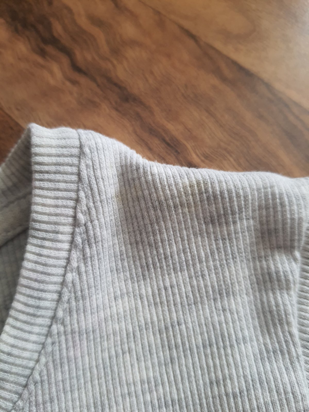 Krásne rebrované tričko. Párkrát oblečené. Z vnútra pri krku trošku zafarbené do ružová, z vonku to nie je vidieť a na 2 miestach malý žltý fliačik, teraz som ich objavila. Nedostatky stačí odstrániť dobrým prípravkom. Pozri foto sú nafotené. Veľkosť je udávaná L, ale sedí skôr na M. Pozri môj bazárik mám toho viac. 🙂