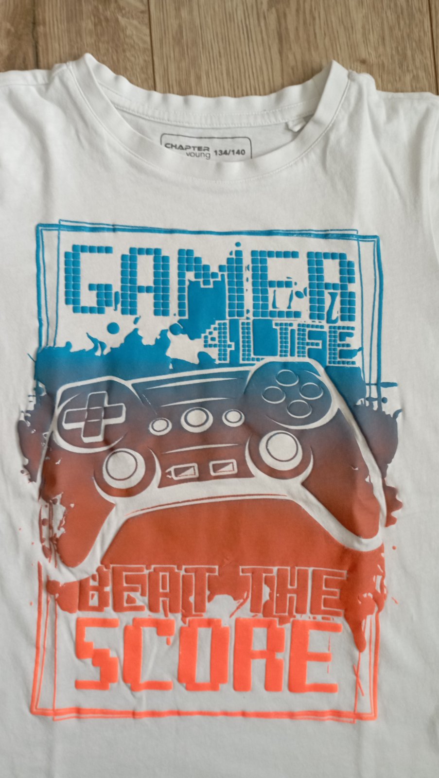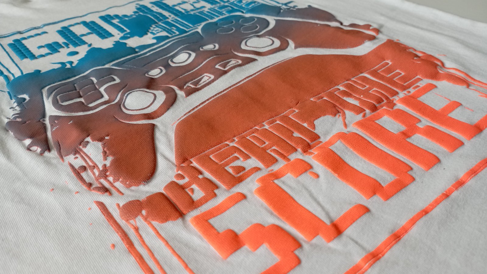 Veľmi pekné tričko bez poškodenia. Potlač je vystupujúca, ukáže to zaujímavo. Farebný prechod z neónovo oranžovej do modrej.