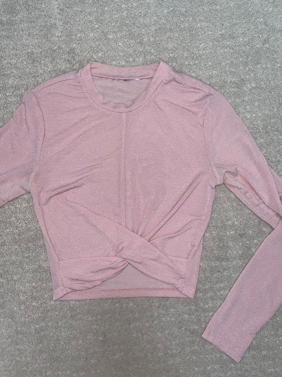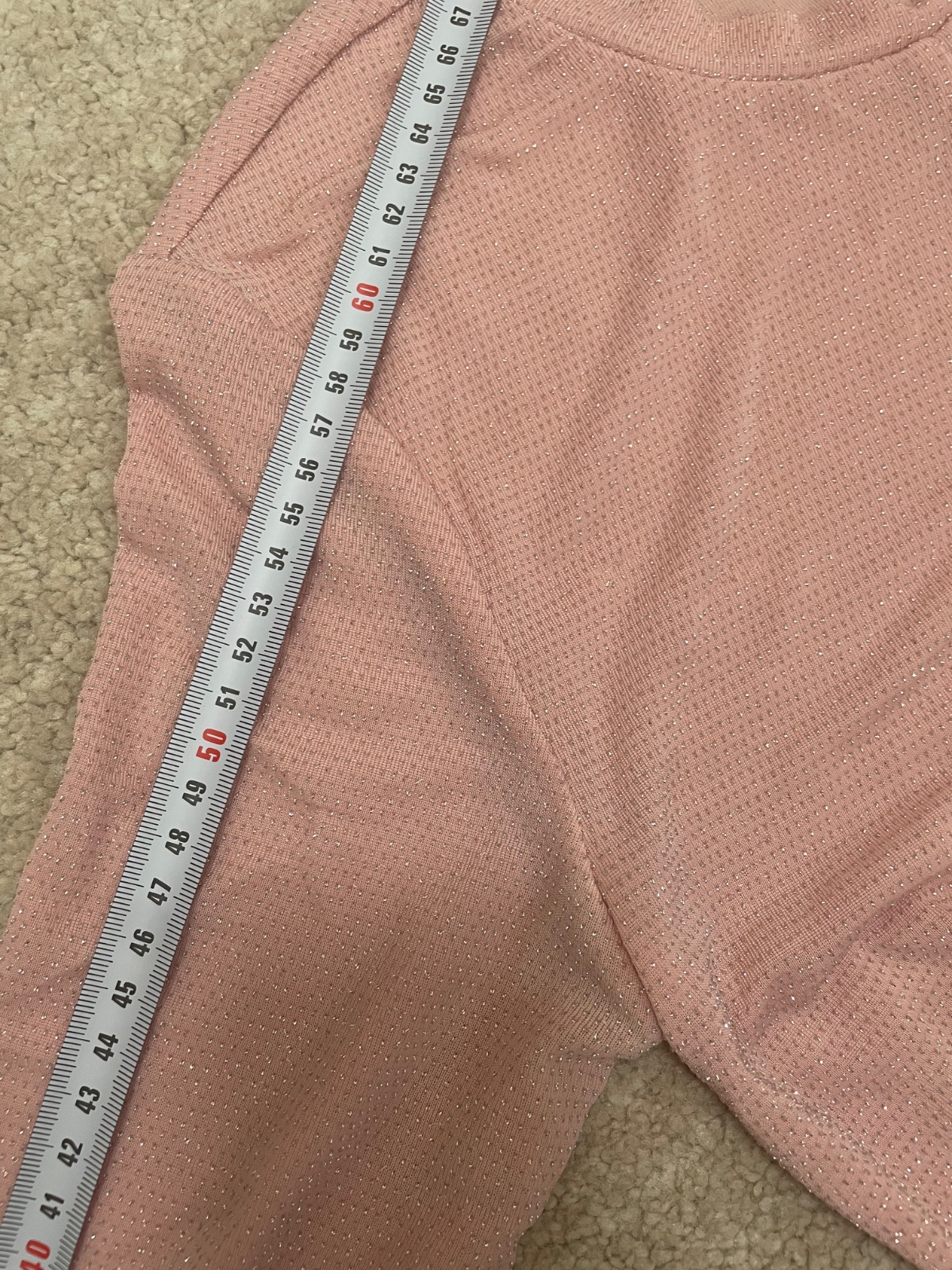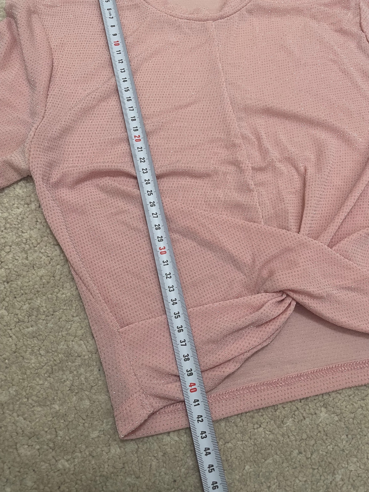 Ružové trblietavé tričko, vpredu riasené, skôr slávnostné/na party. Skutočnú farbu najlepšie videť na prvej foto.