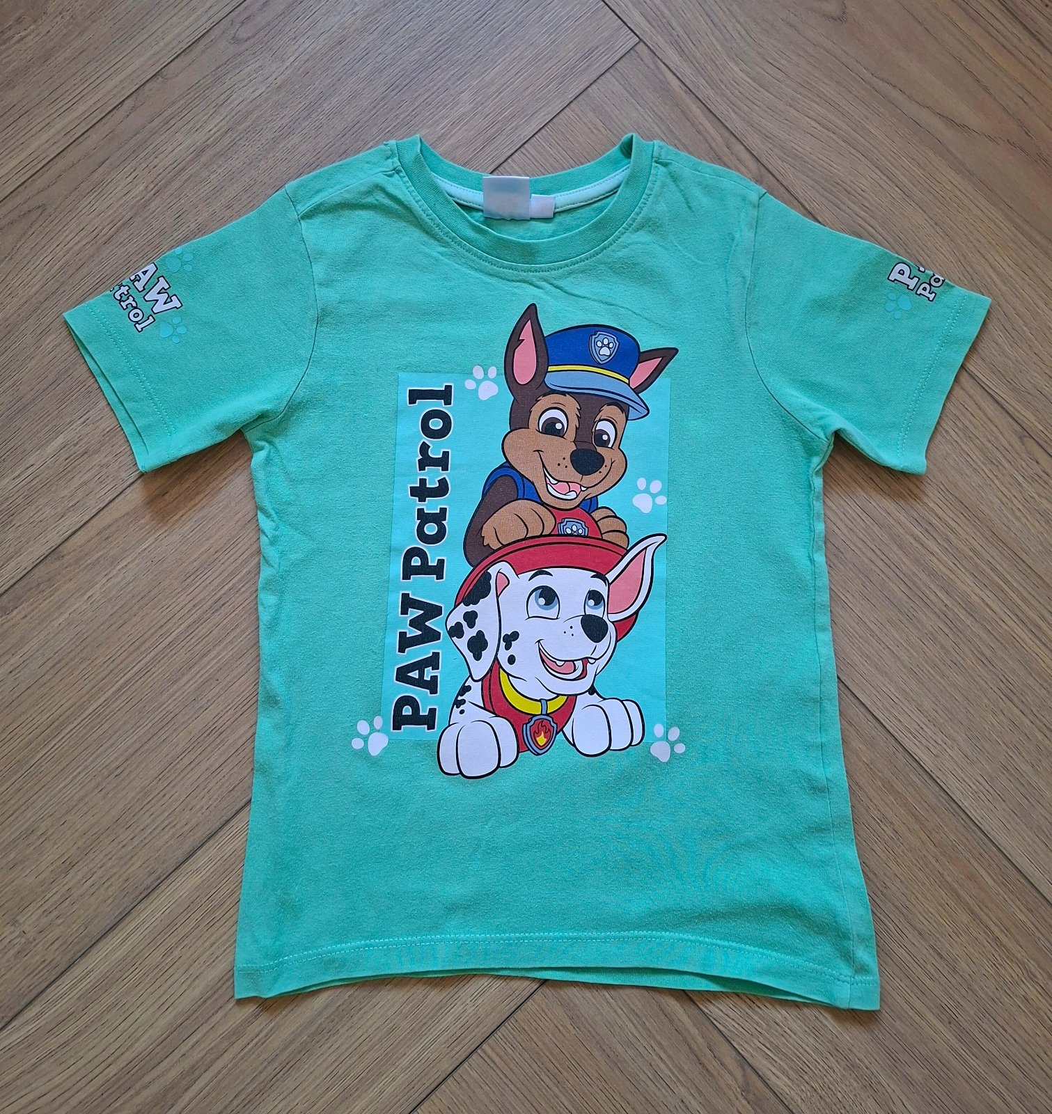 Bavlnené chlapčenské tričko s motívom Labkovej patroly vo veľmi dobrom nosenom stave (bez dierok, fliačikov a žmolkov; jemne spraté (detail viď foto)). Farby: tyrkysovomätová (fotka tento odtieň skresľuje, naživo je sýtejší). Značka: Pepco (odstrihnutý vnútorný štítok); veľkosť: 110 (4 - 5 rokov).