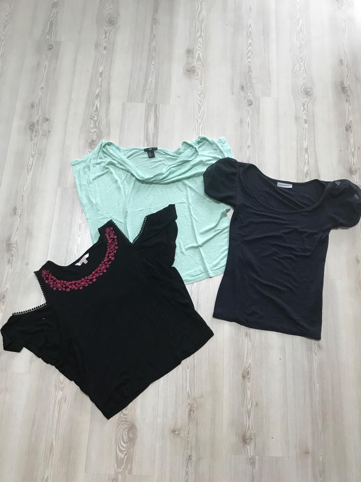 Tri tricka vsuper stave, zaujimave strihy. Cierne s vysivkou ma hole ramena, tmavomodre ma priesvitne rukavy a mentolove je Mko, taky siroky volny strih. Vsetky spolu.