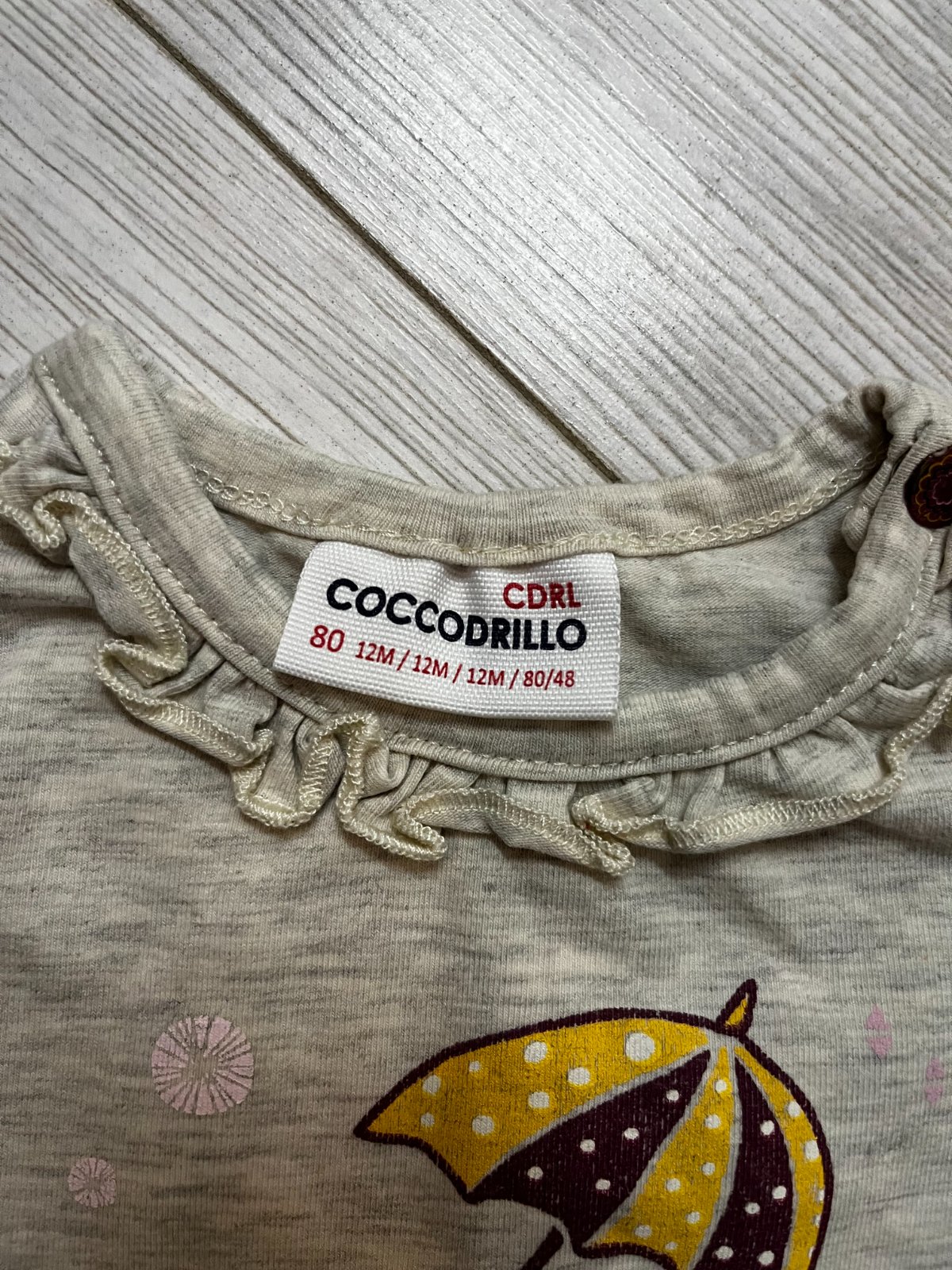 Predám bledosivý dlhorukávový top s obrázkom myšky v spodnej časti s volánom značky Coccodrillo, veľkosť: 80 (9 - 12 mesiacov).