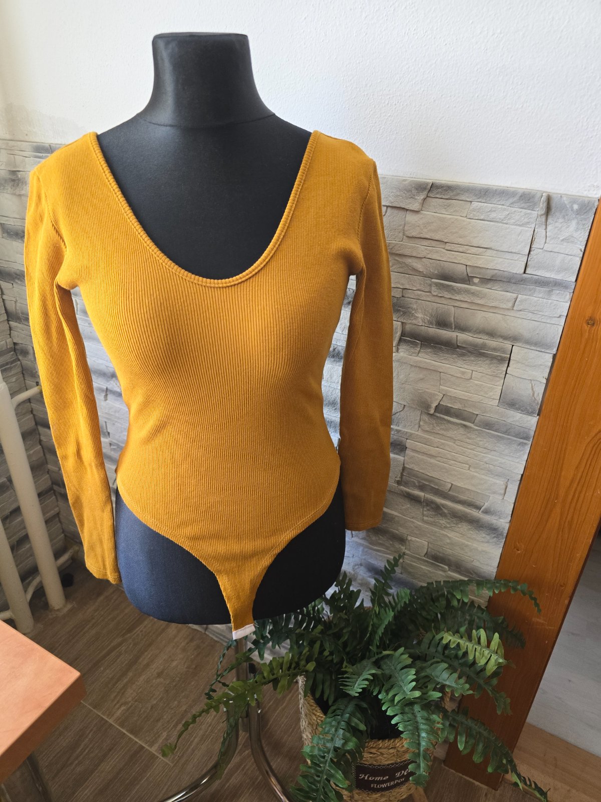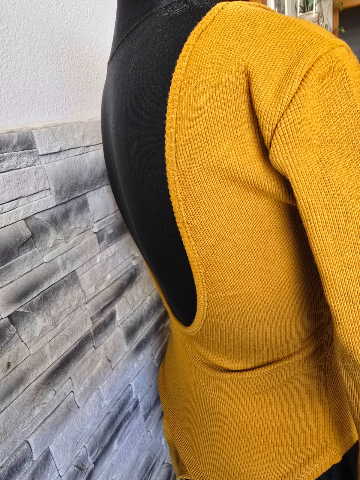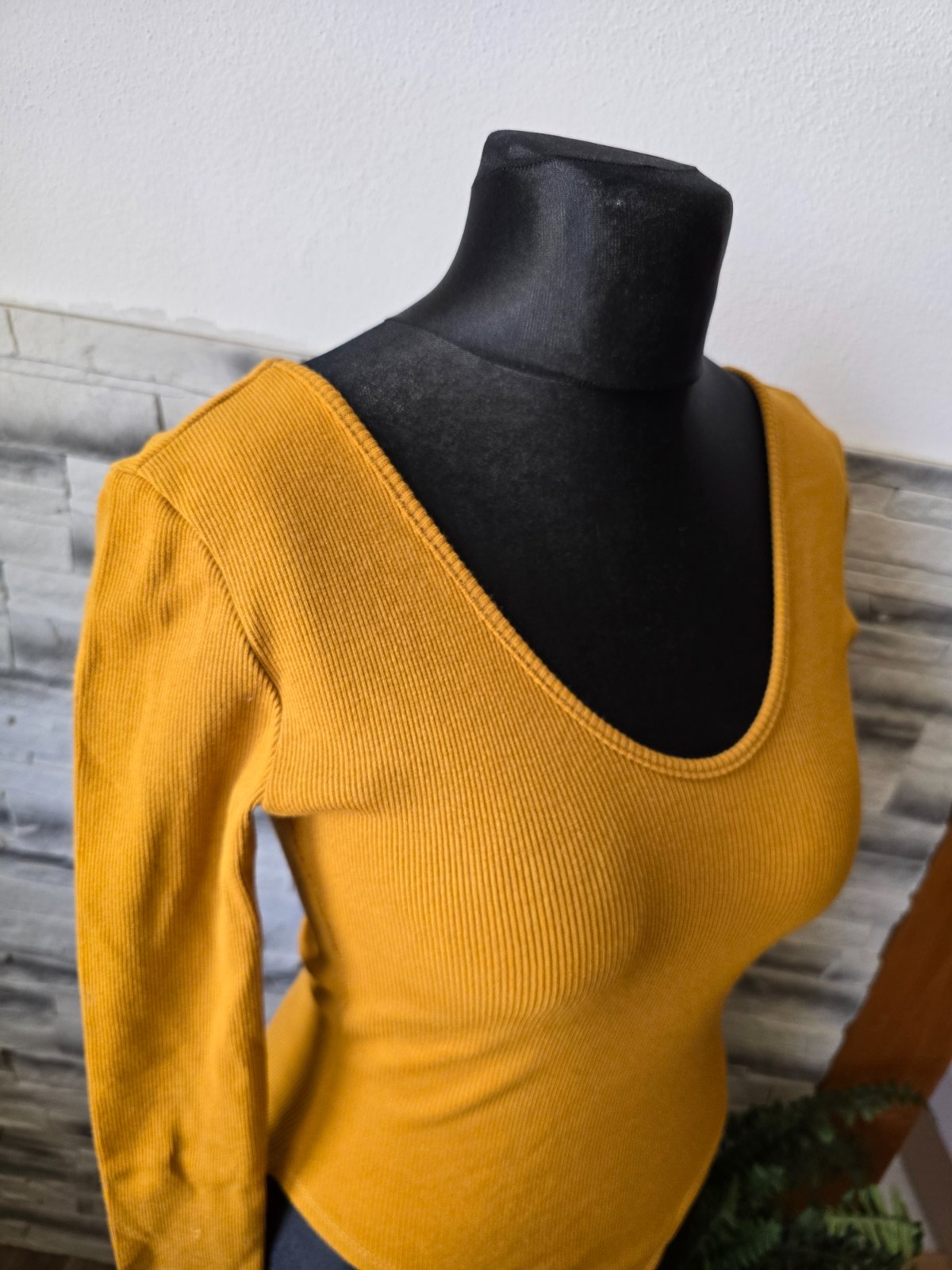 Tričko horčicovej farby, veľ. S, na ramenách má výstrih