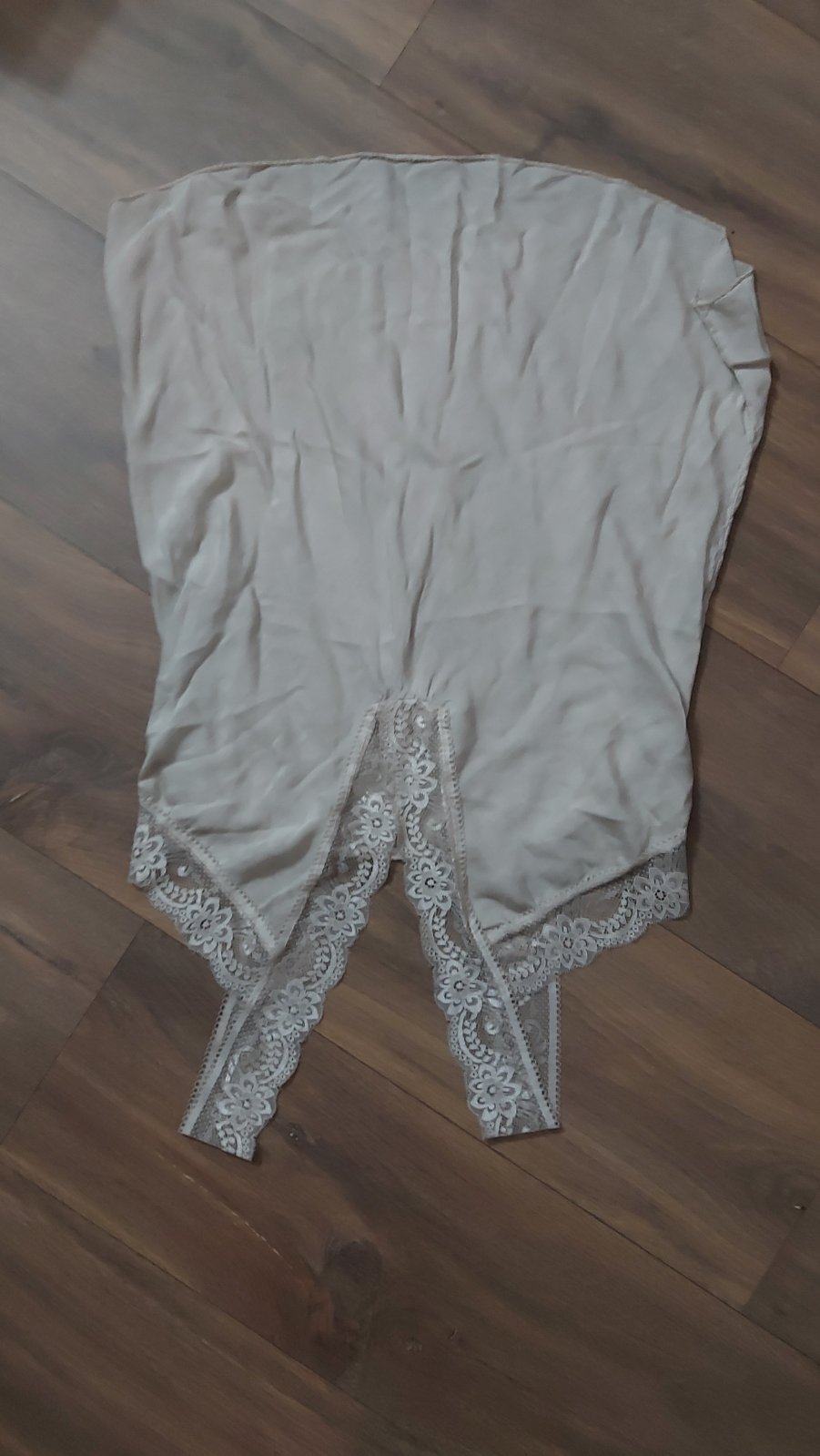 Predám top. Svetlucko hnedej farby s lesklou aplikaciou. Veľkosť nieje uvedena ale také S. Rozmery na foto.