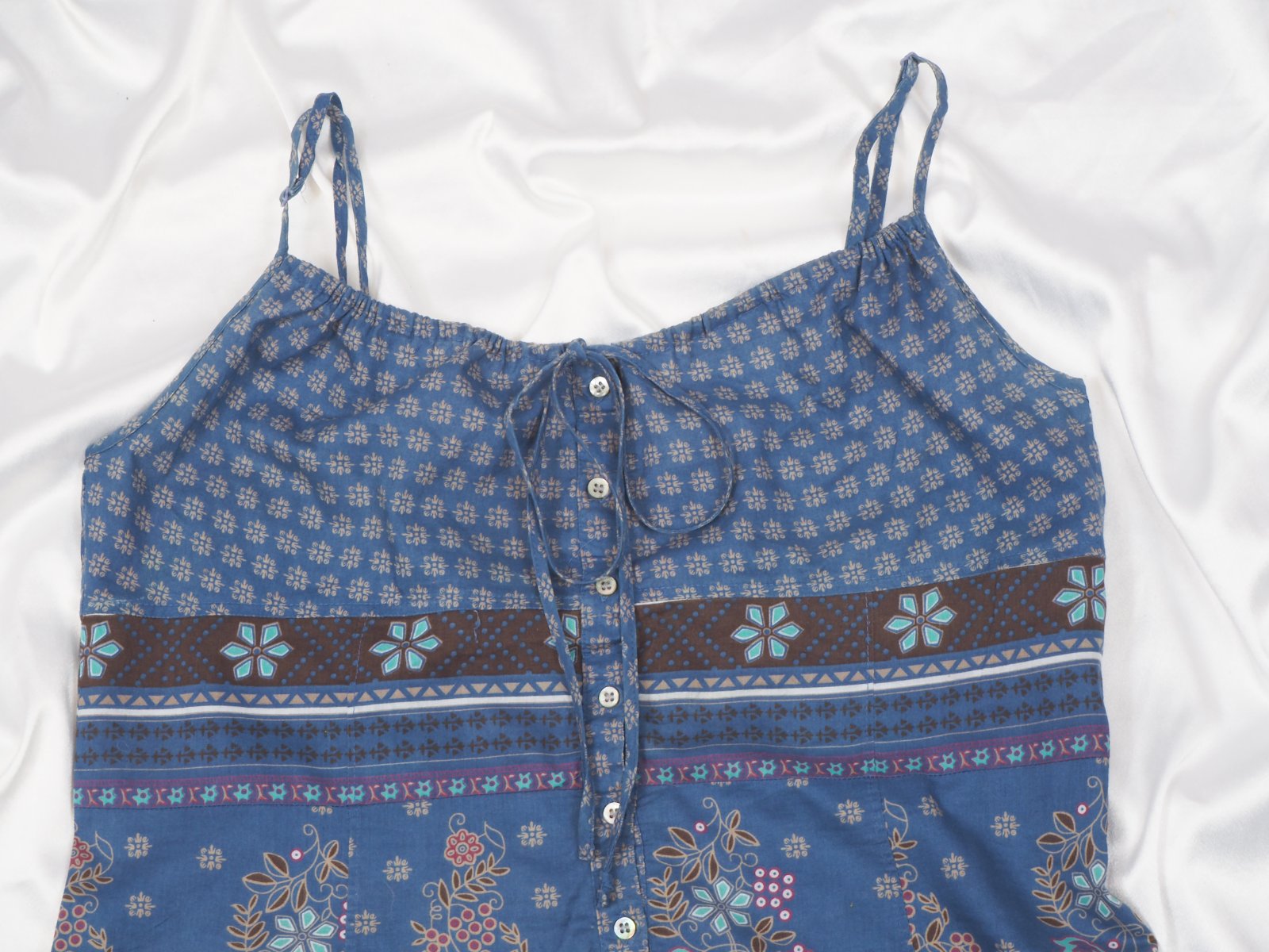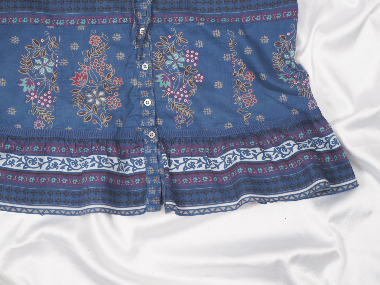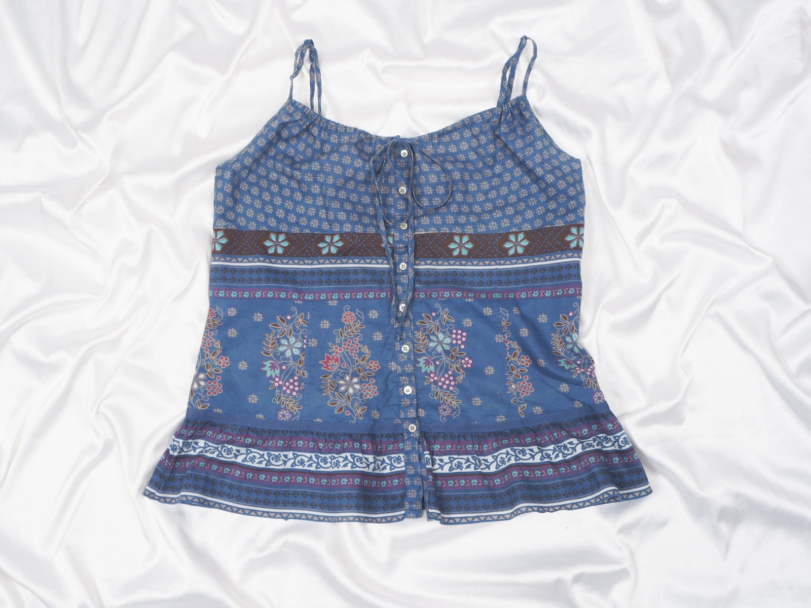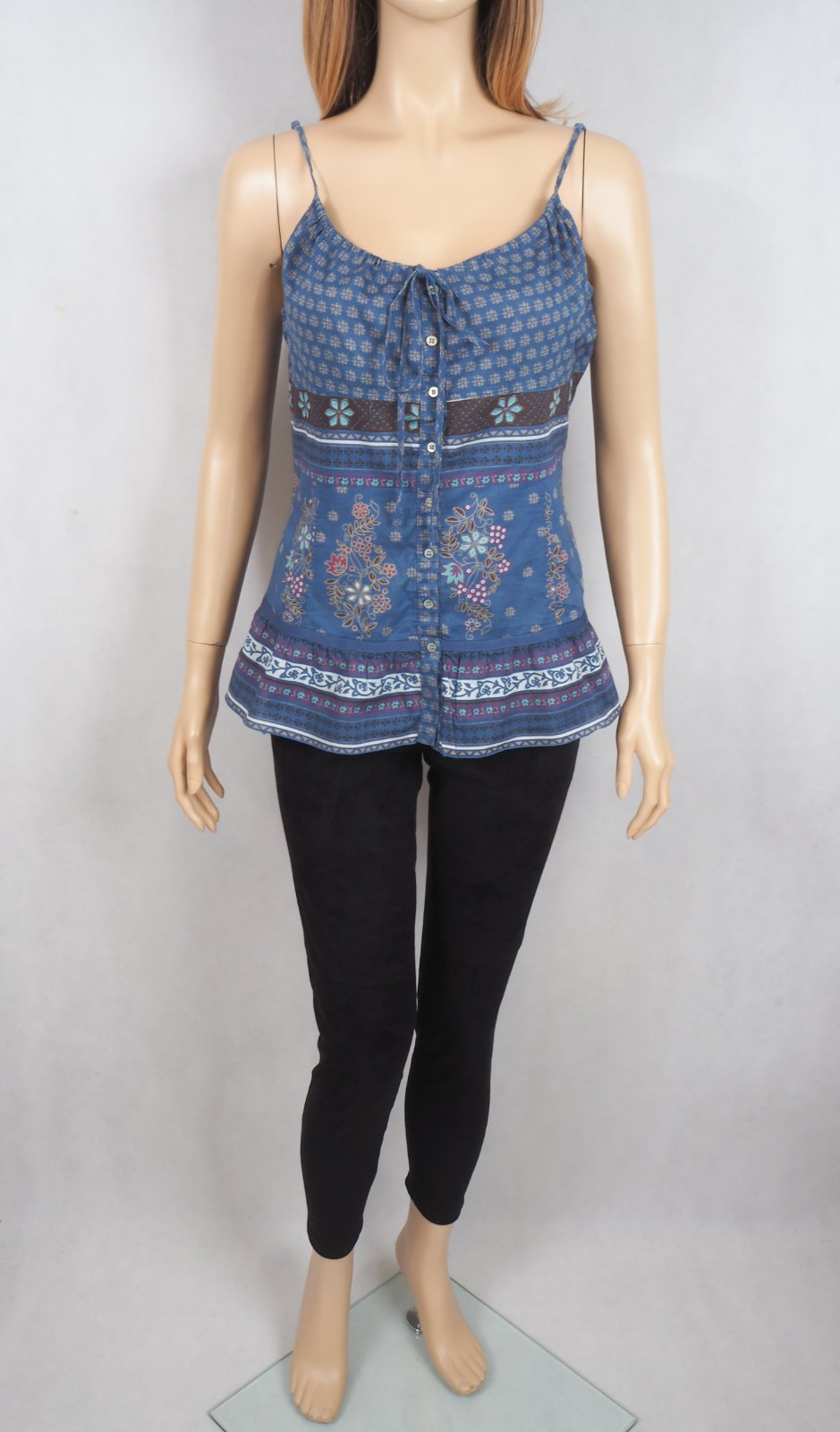 Kvalitný letný top modrej farby so vzorom, vpredu zapínanie na gombíky, materiál bavlnený, super stav.