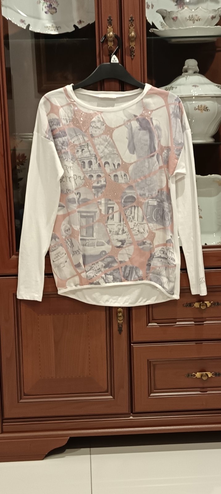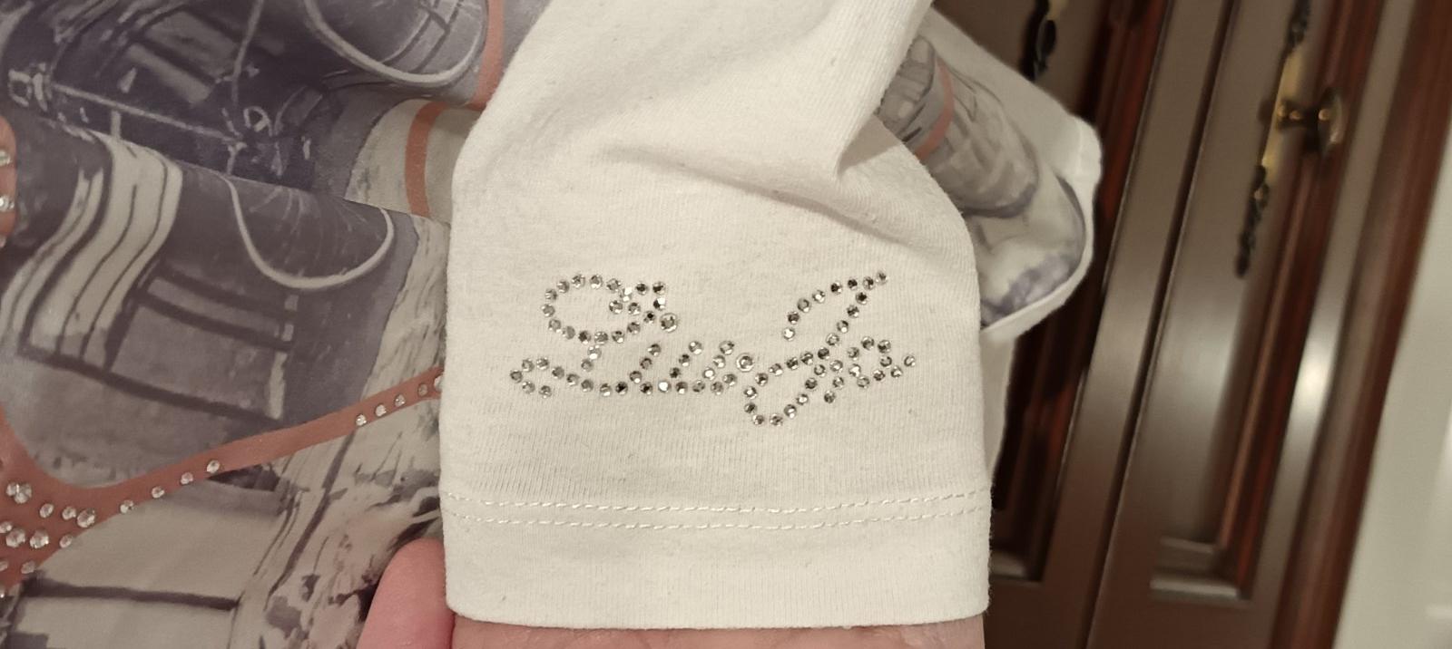 Krásna, zadok a rukávy je tričkovina, predok z hodvábu, 98% bavlna, 2% elastan, predok nie je priesvitný, zdobený kamienkami, logo s kamienkov aj na rukáve, zadok jemne predĺžený, na predku dole sú dve faldičky, veľmi pekne sedí ako voľné, ležérne jemne podkasané tričko - blúzka, super stav.