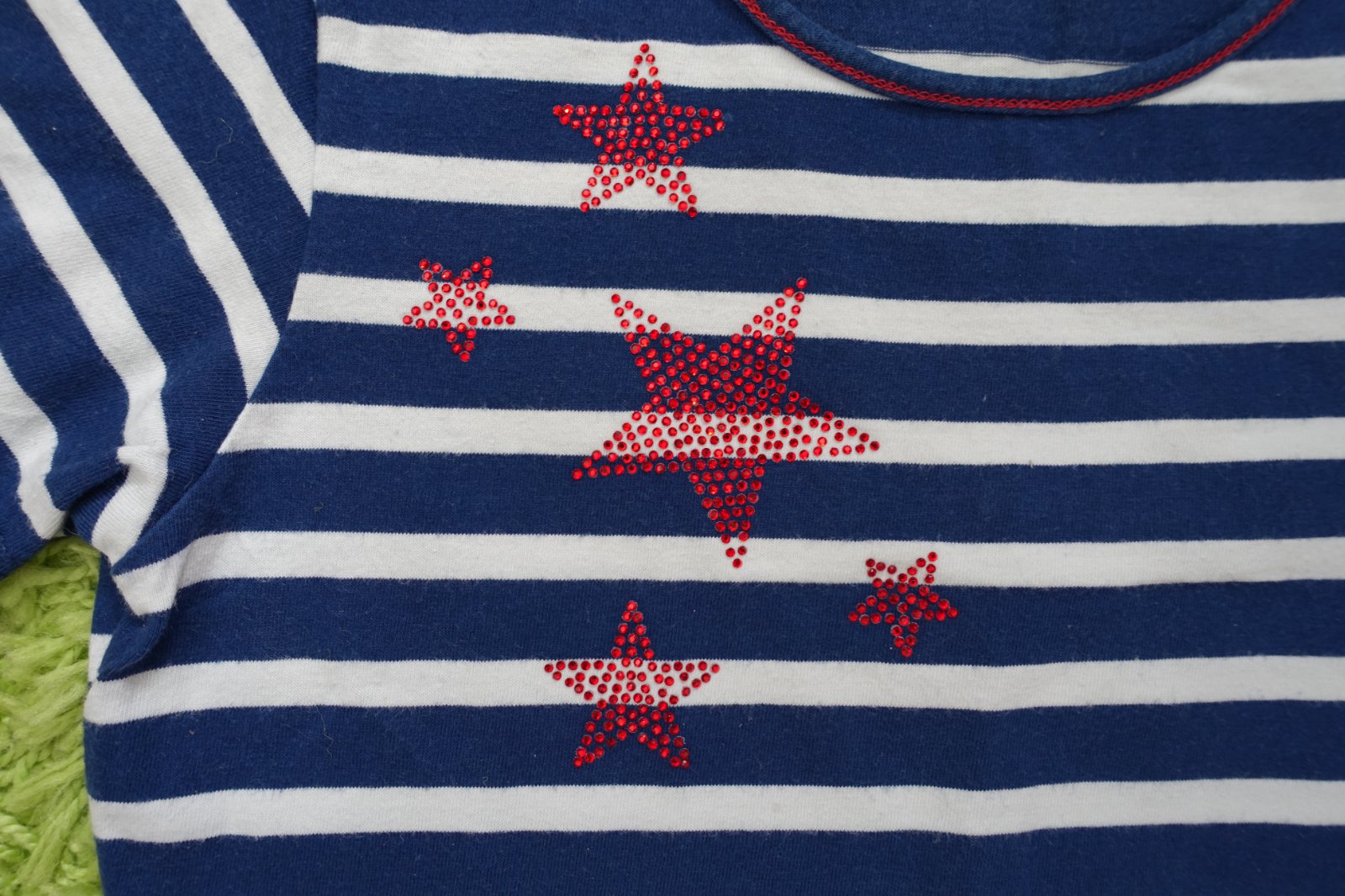 Predám krásne pásikavé modro biele tričenko s trblietajúcimi sa červenými hviezdičkami. Bolo nosené na striedačku aj s inými, ale je v peknom nosenom stave. Donosiť sa určite ešte dá. Ak len po byte ešte poslúži. Celková dĺžka je 56 cm. (G)