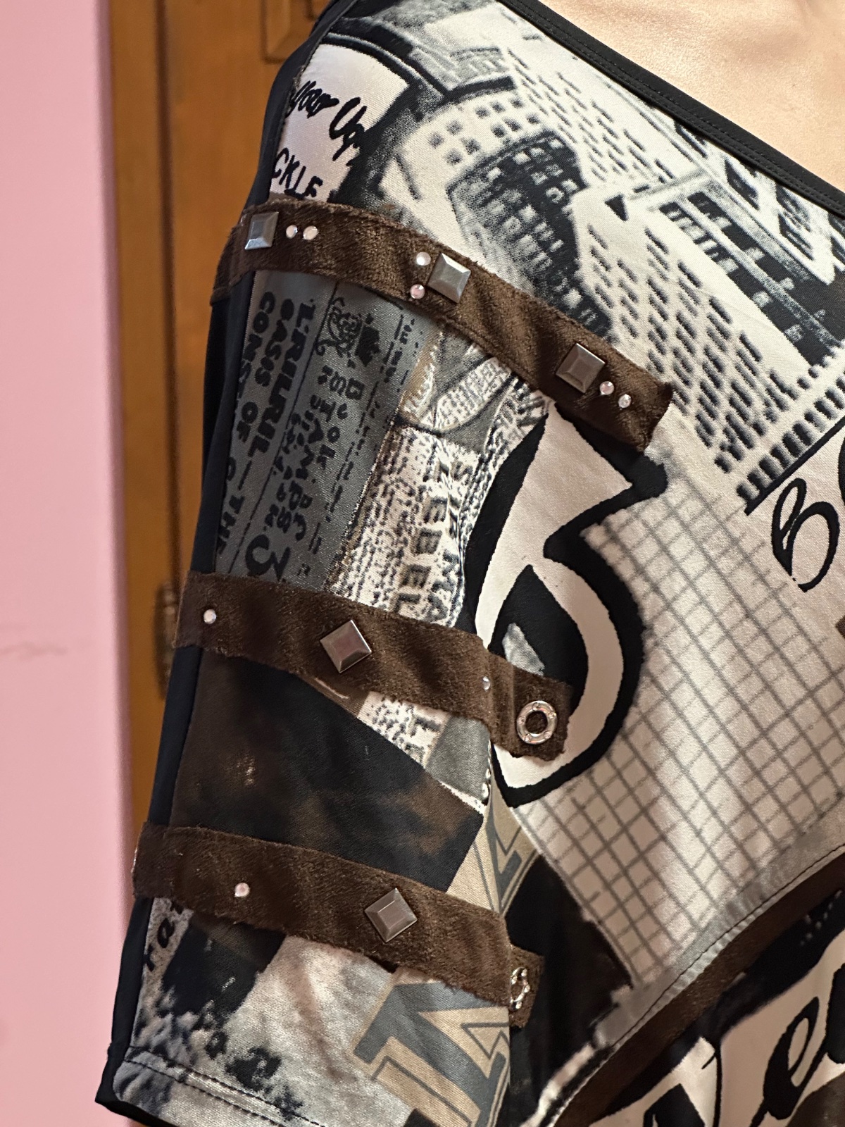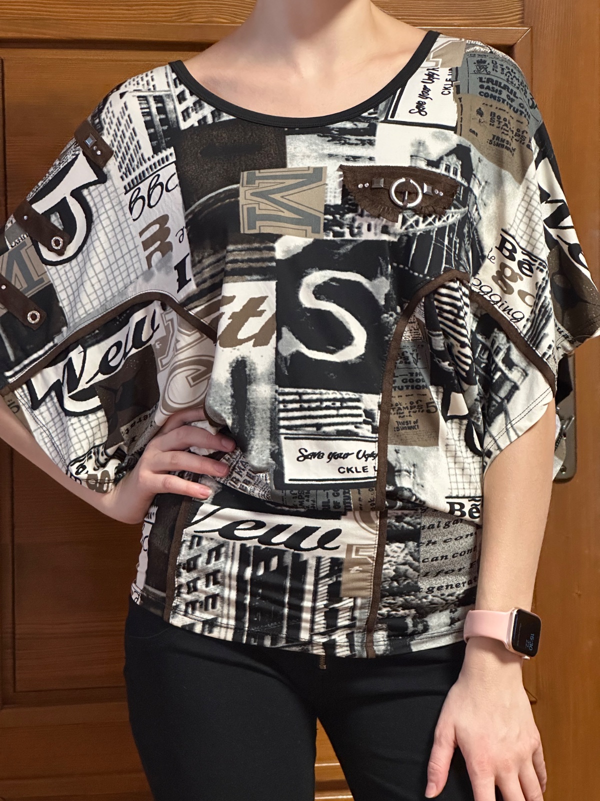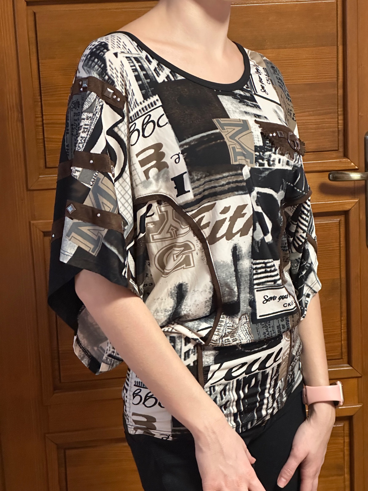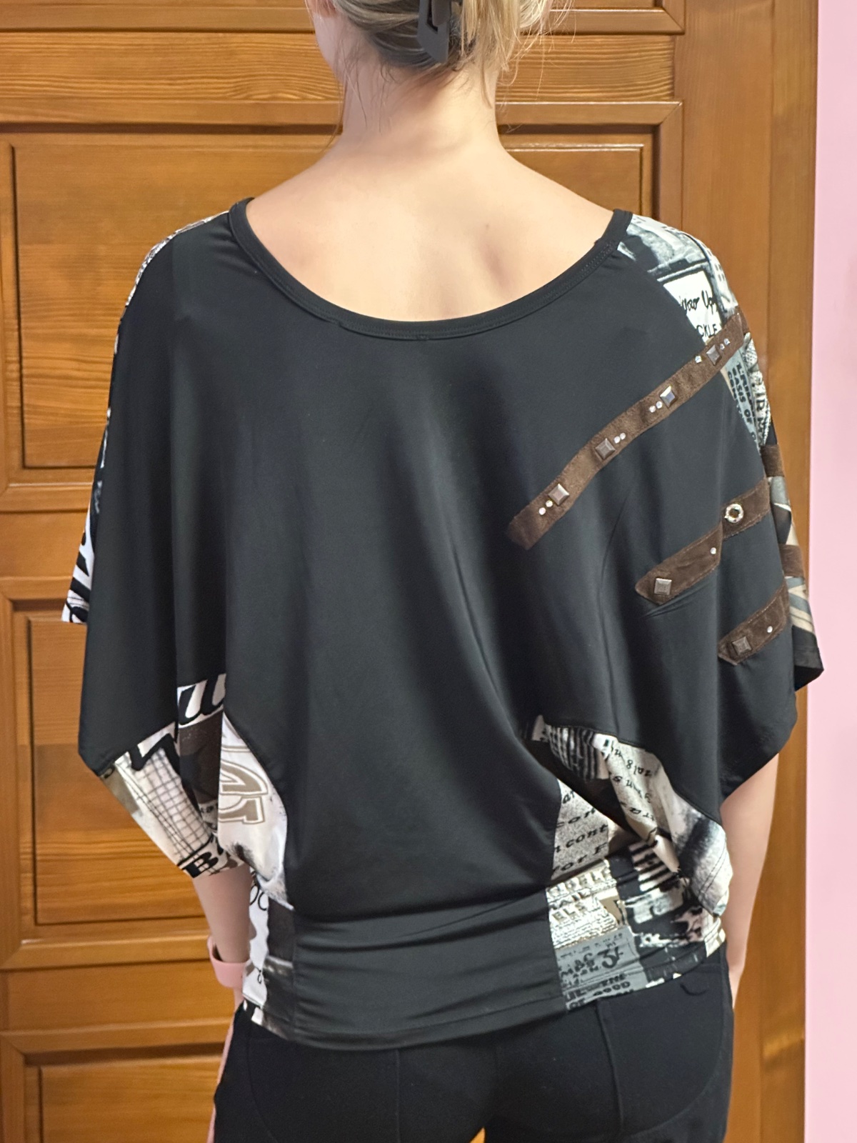 Tričko má zaujímavý moderný dizajn v čierno-béžových tónoch s potlačou a ozdobnými detailmi (aplikácie, nitky), vďaka čomu pôsobí štýlovo a originálne.