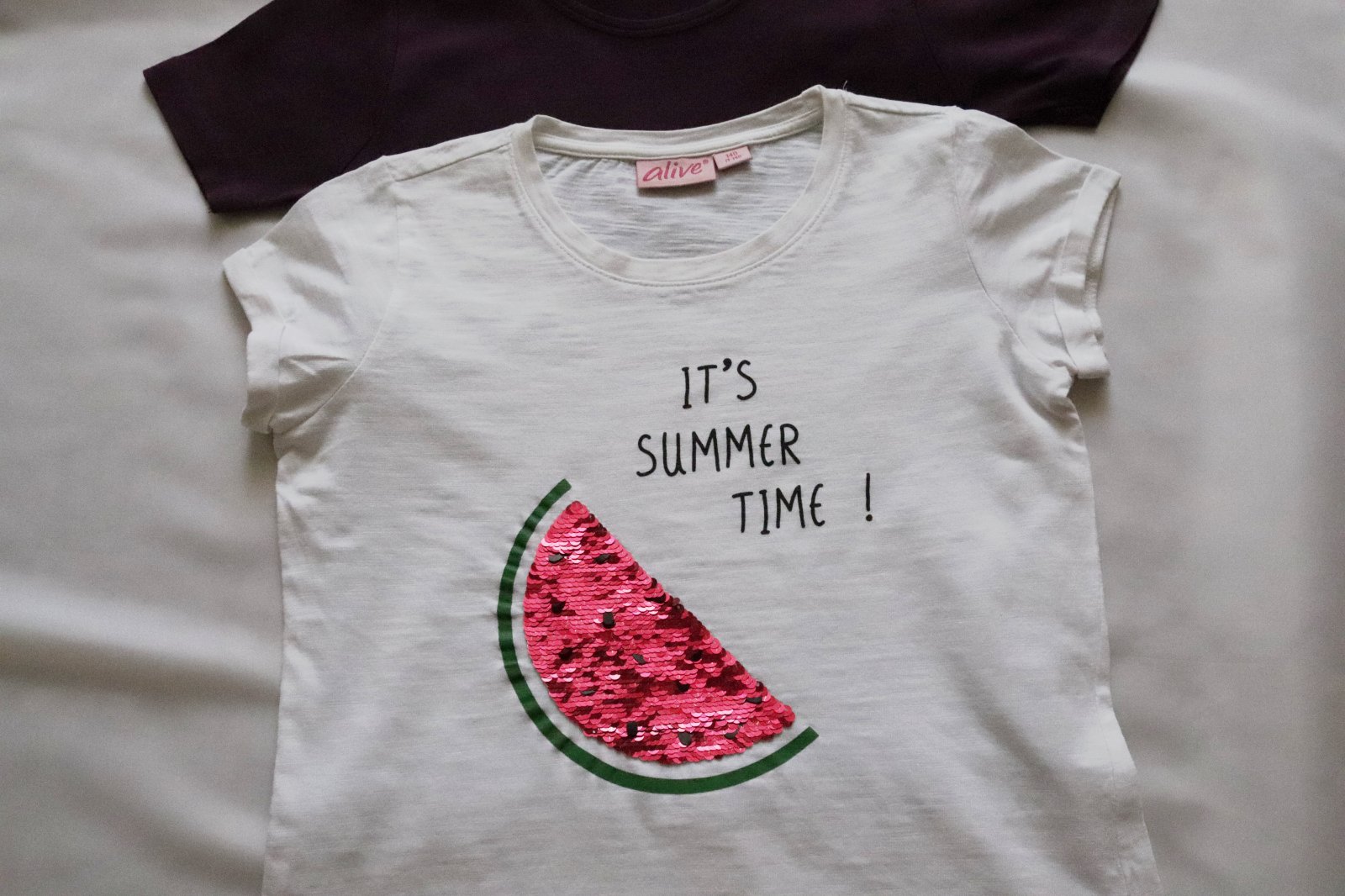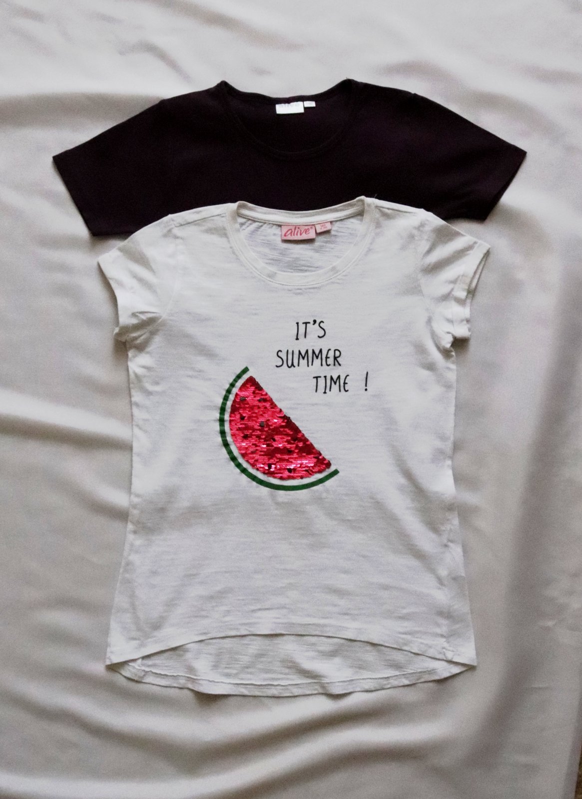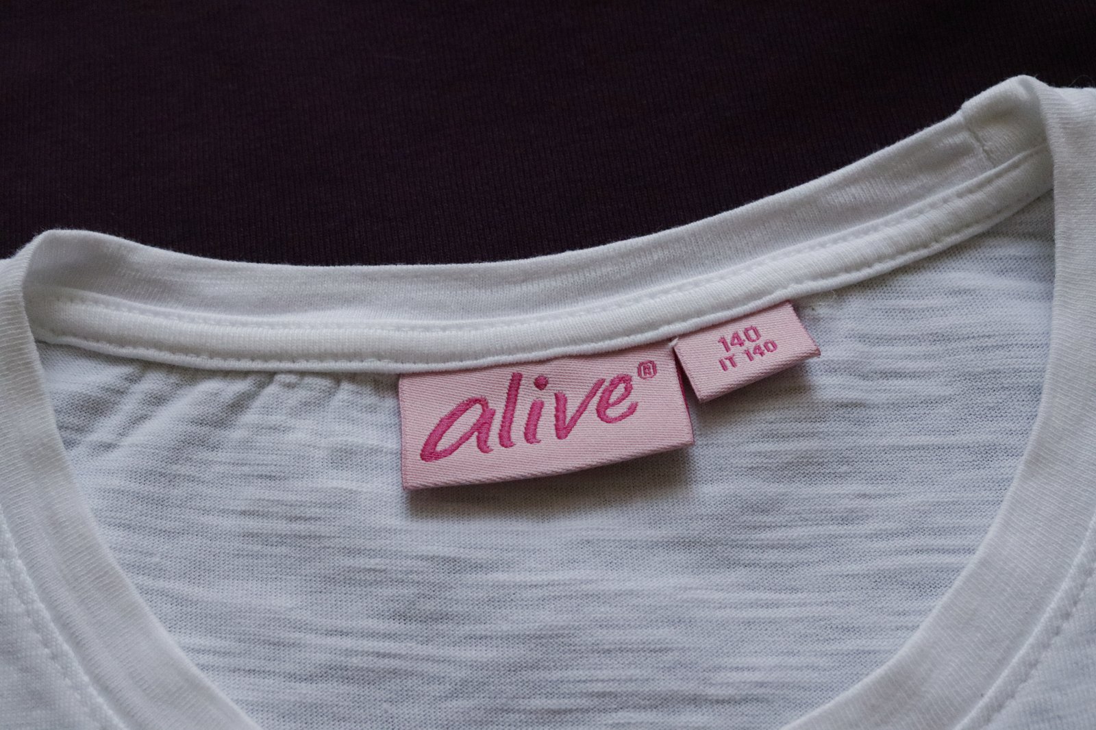 2 kusy kvalitných bavlnených tričiek Zn. Alive, biele a tmavo fialové, obe 100% bavlna.