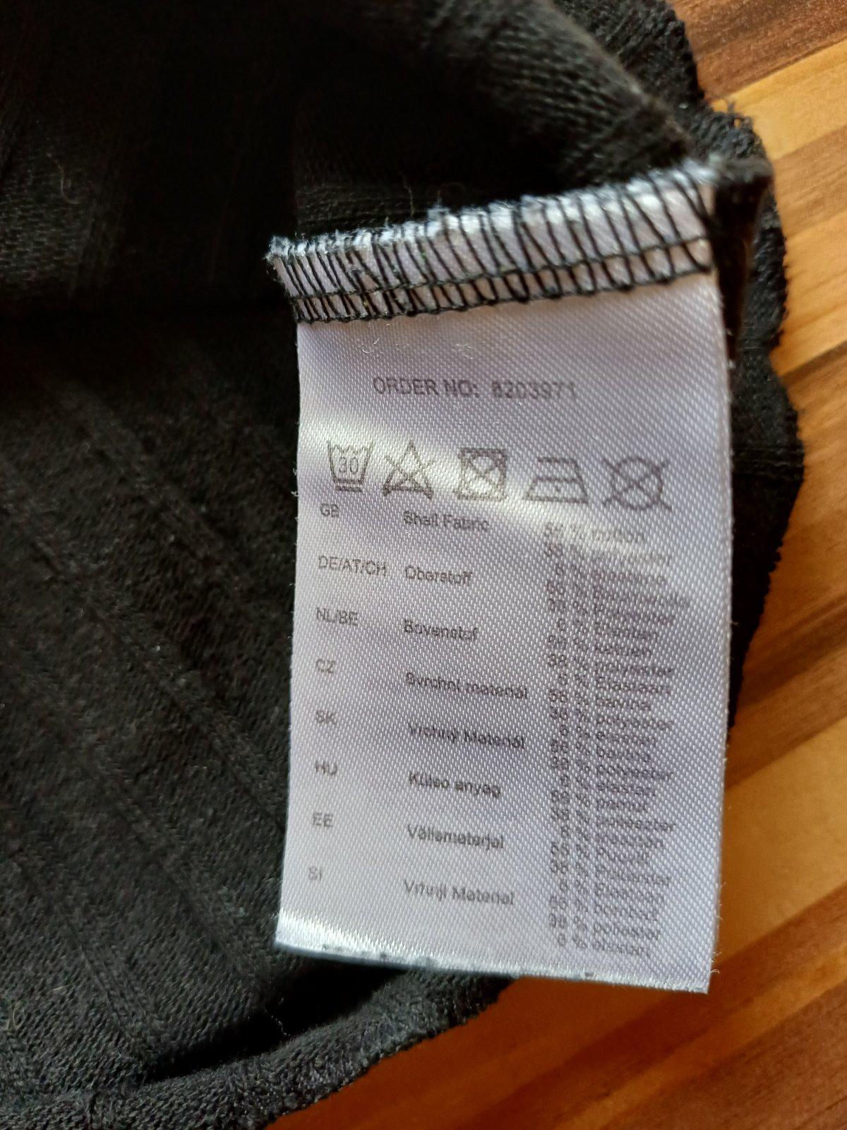 Tielko zn. Takko, veľ. sedí na L - pozri rozmery. Čierne, vrúbkované, so špagetovými ramienkami (gumičky), na hornom leme čipka. Materiál 56% bavlna, 38% polyester, 6% elastan. Rozmery: dĺžka od ramena po spodný okraj 54 cm, šírka cez prsia 39 cm.