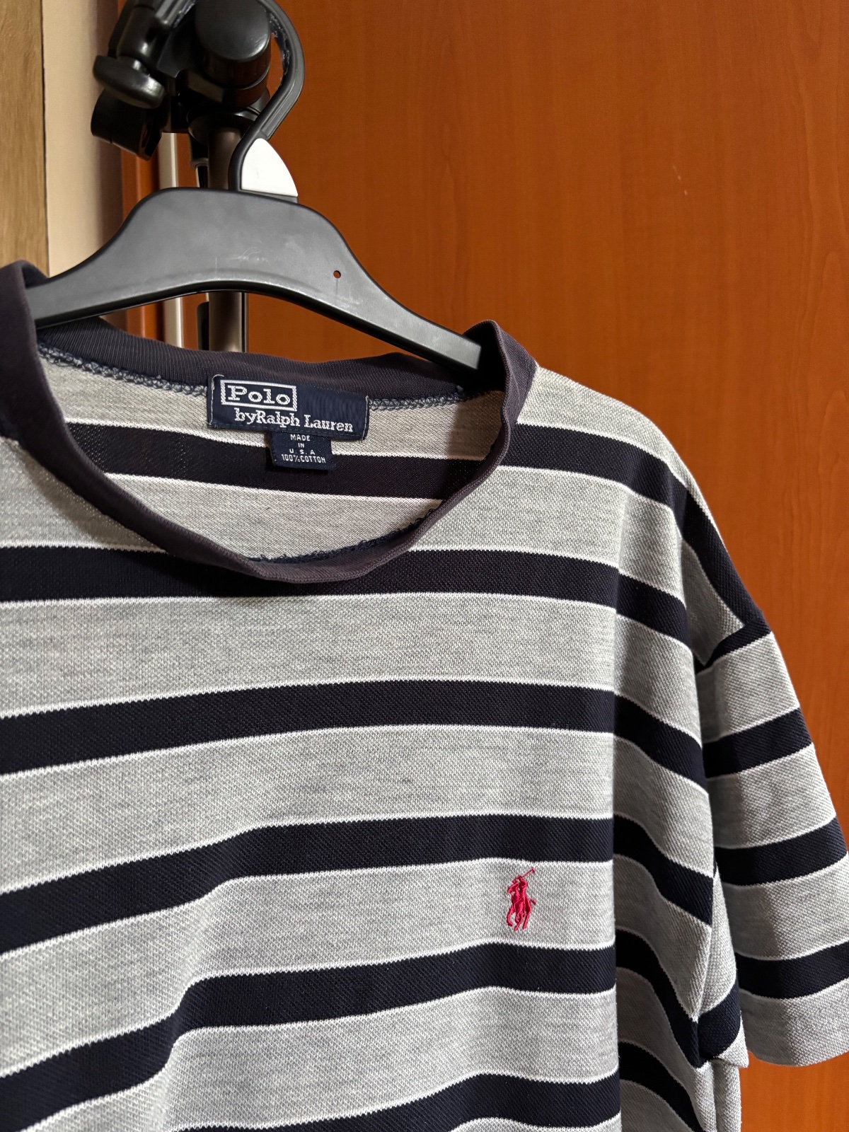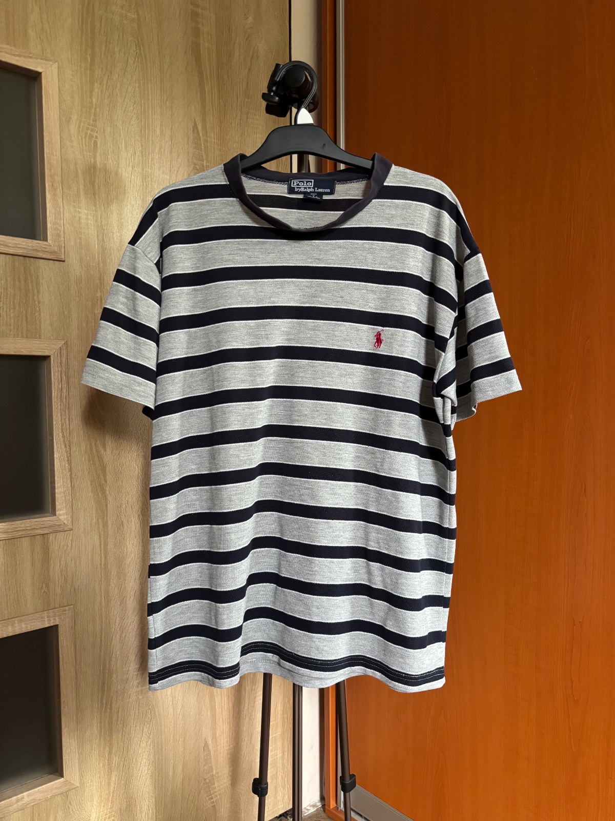 Pásikavé sivé tričko značky Polo Ralph Lauren. Tričko bolo vyrobené v USA. Materiál 100% bavlna. Super stav len trochu vyťahaný golier.