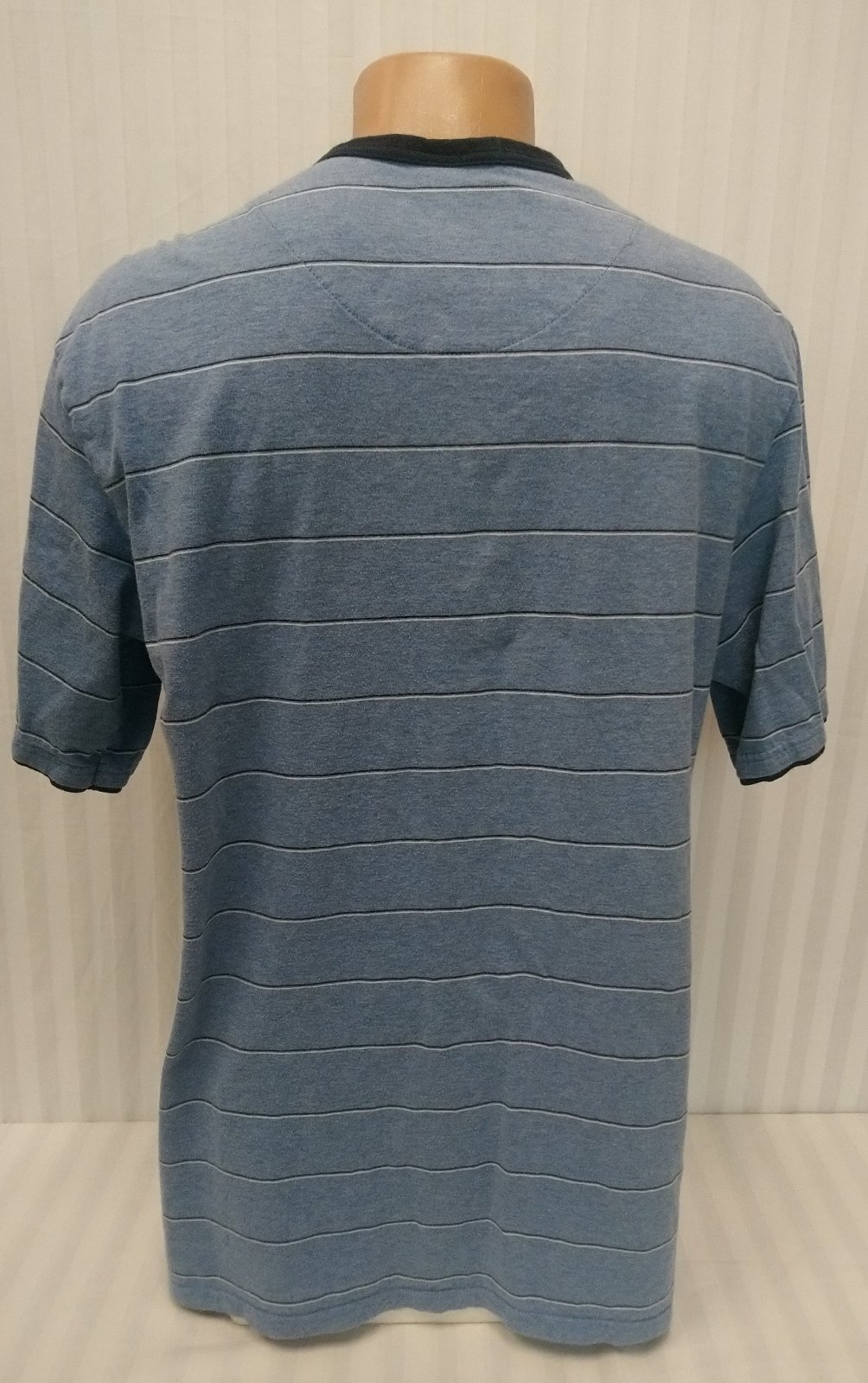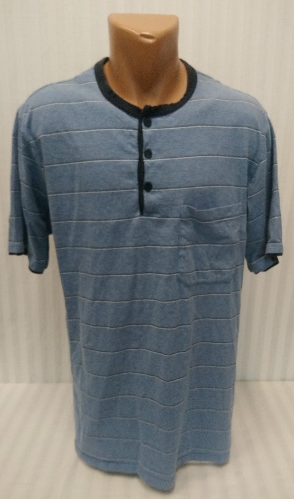 pánske modré pásikavé tričko, zapínanie na gombíky ku krku, čierne lemovanie,