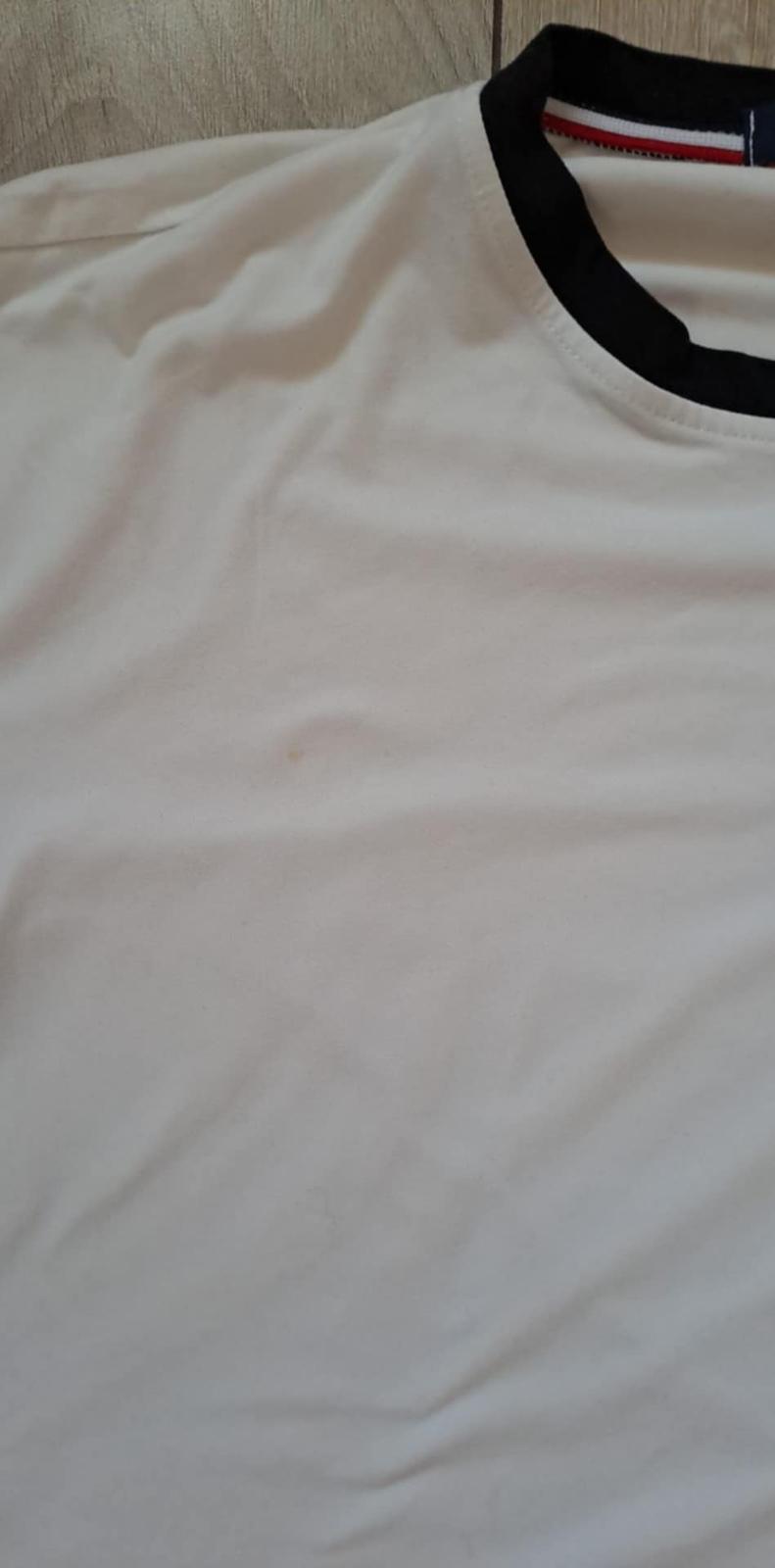 pánske elastické krémové tričko s plastickým vorom a sivým motívom, golier, nie je úplne tenké, nie je ako tričkovina, príjemný kvalitný materiál, zloženie: 95 % bavlna, 5 % elastan, stav: výborn...