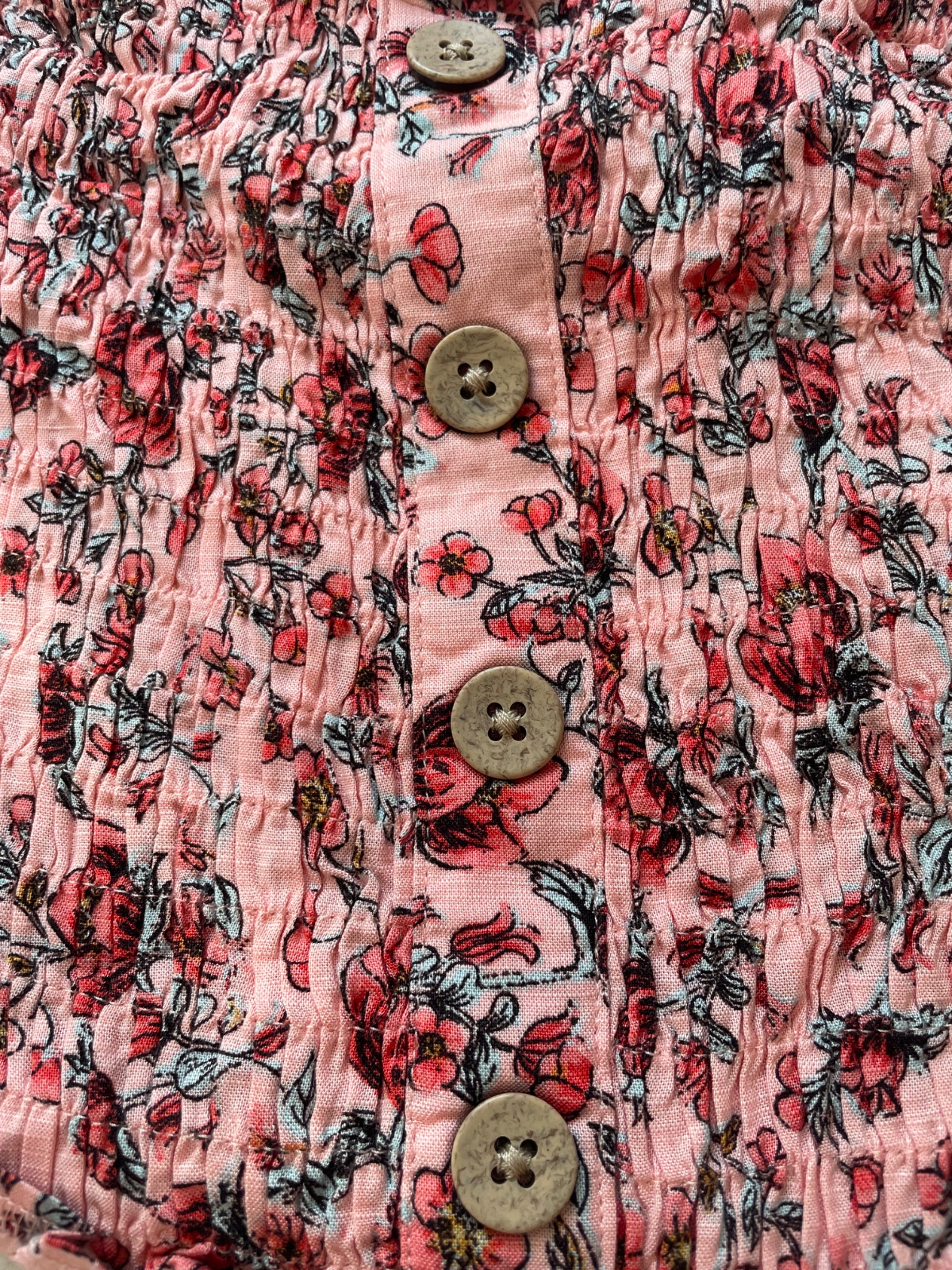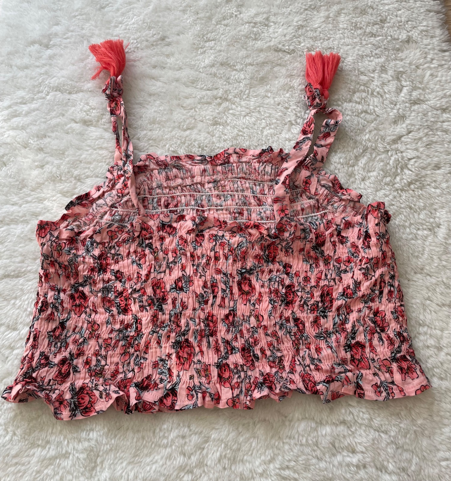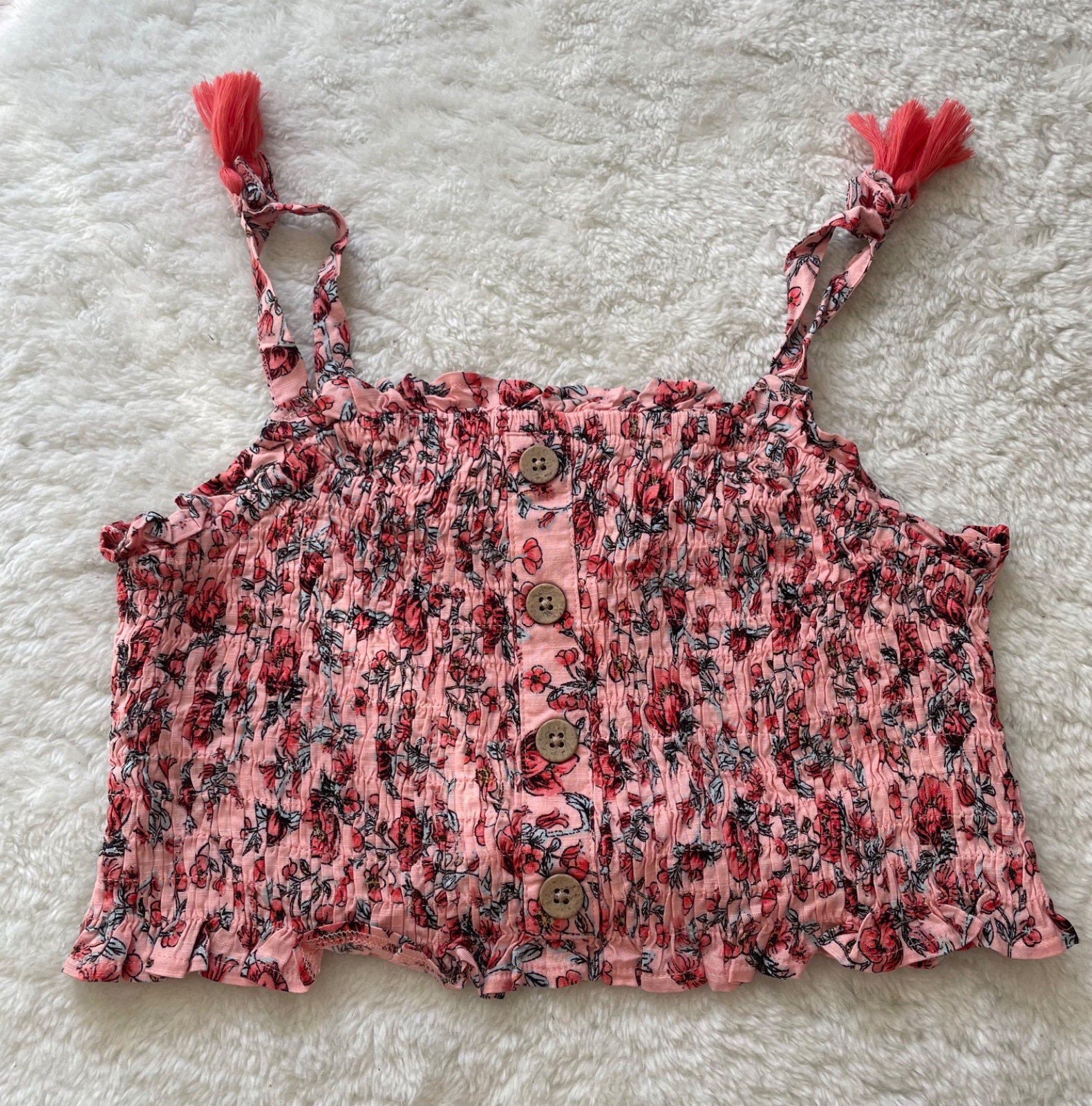 Bluzkovy kvetinkovy crop top na ramienka, obzvlastneny strapcami, gombickami, pre 10 r paradnicu, cely je natahovaci, popresivany gumickou, material viskoza
