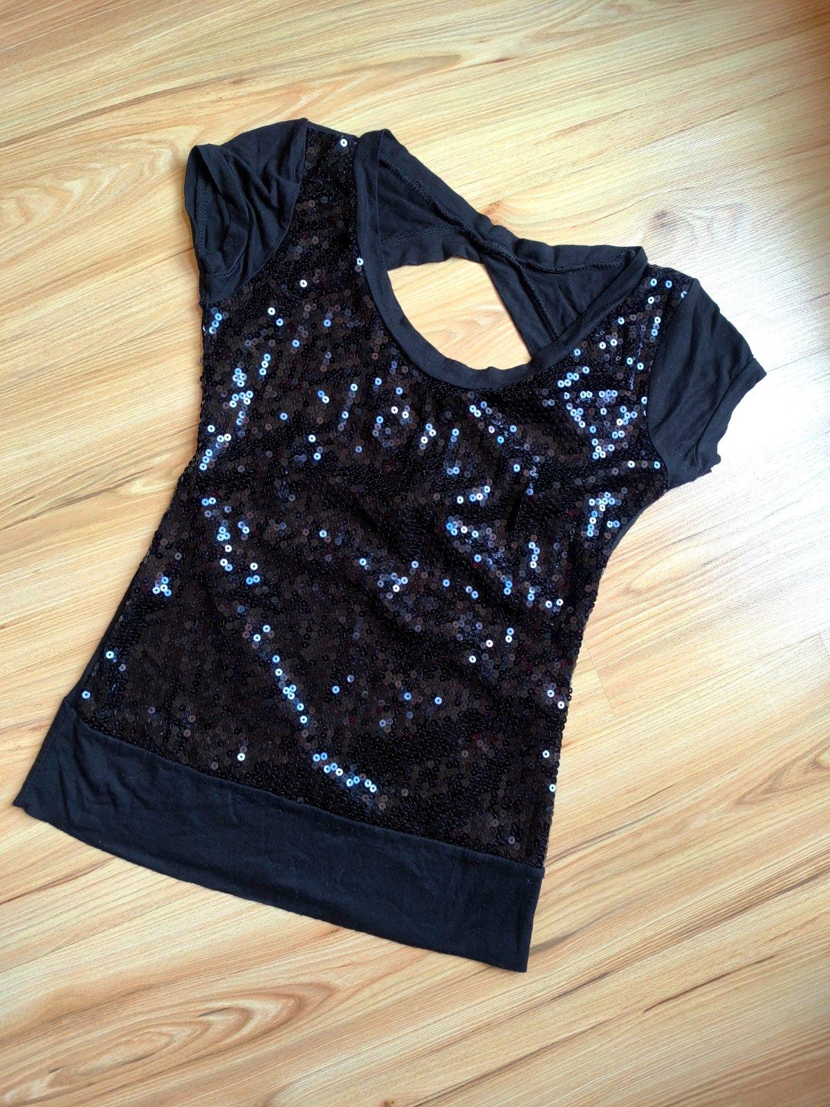 Čierny top s flitrovanou prednou časťou, vzadu odhalený chrbát, uväzovanie na chrbre, velmi dobrý nosený stav. Sadne na S a M.
