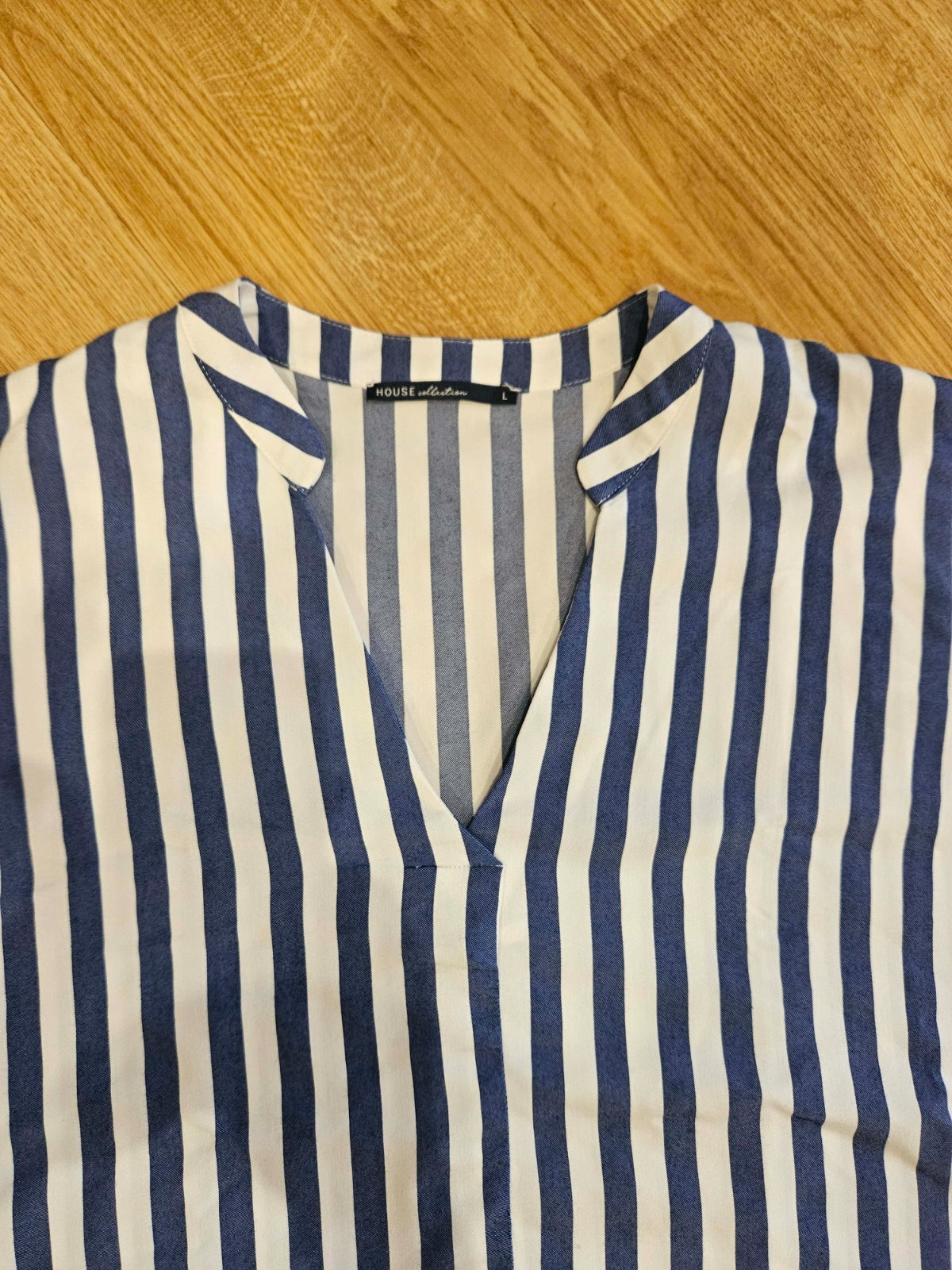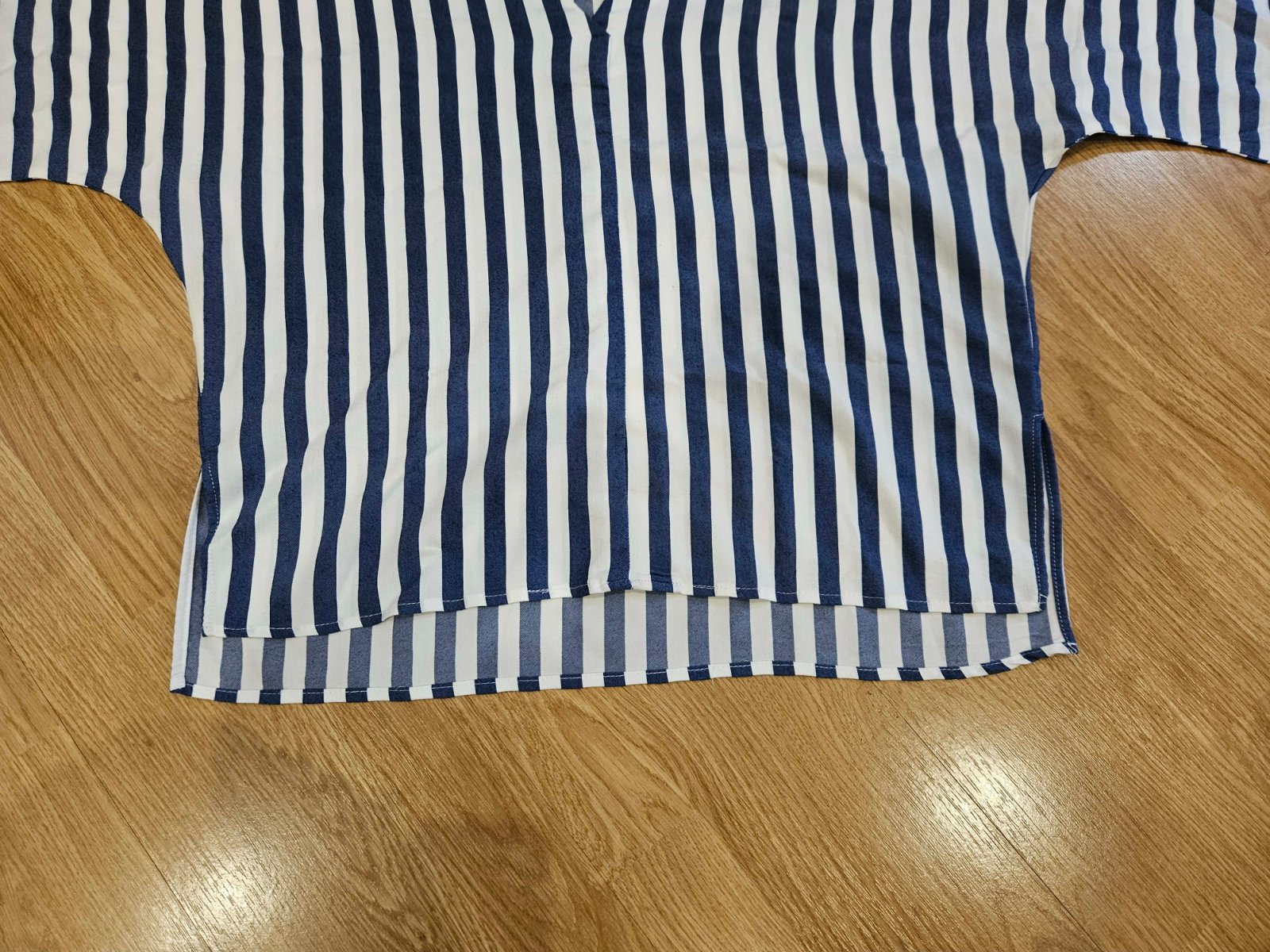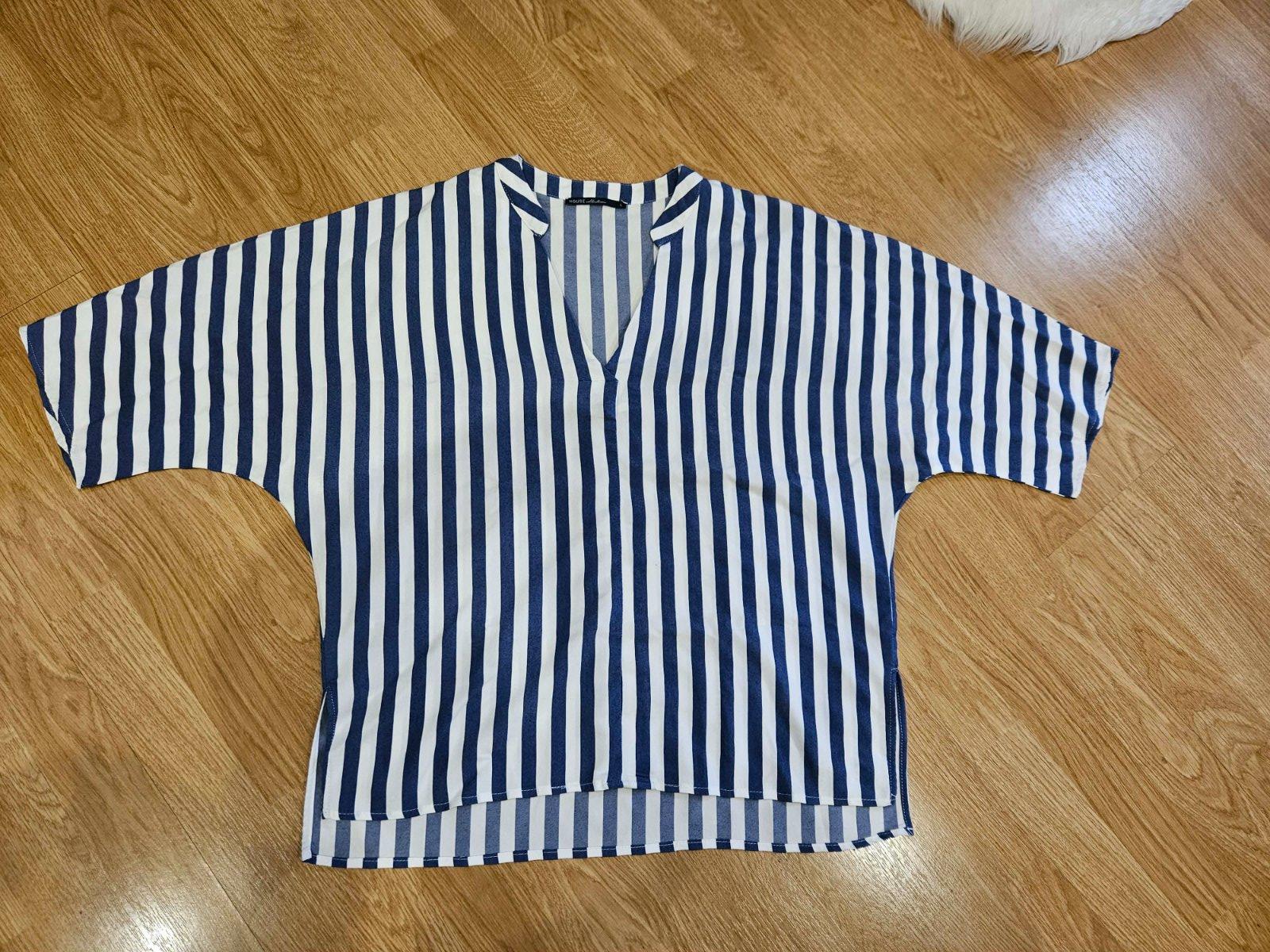 Výborný stav, rukáv raglánový, modro - biely pásik, dole po bokoch rozparky, v predu máličko kratšie, šírka dole, kde začínajú rozparky je 56 x 2 cm.